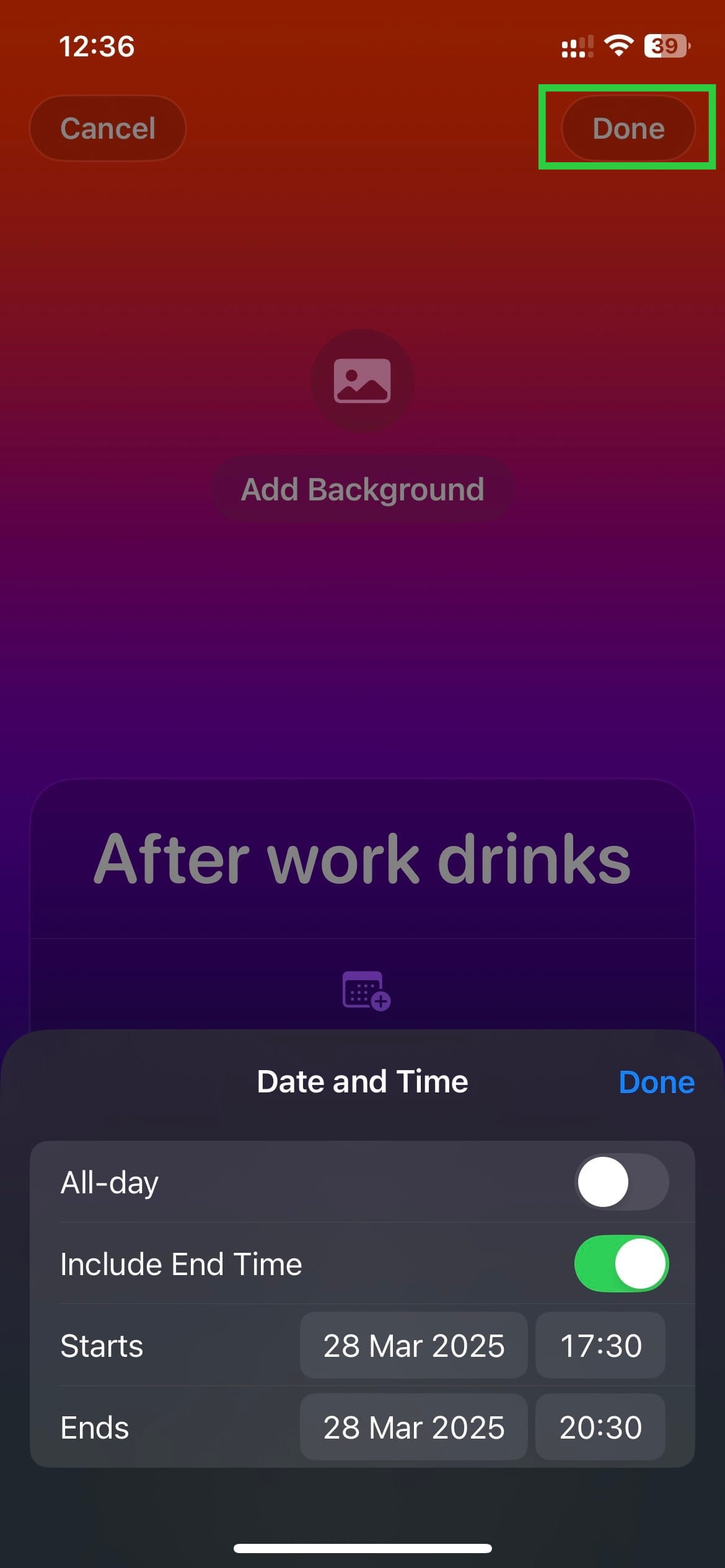 Step 2: Type in the event title and enter the date and time. Tap Done after that.
