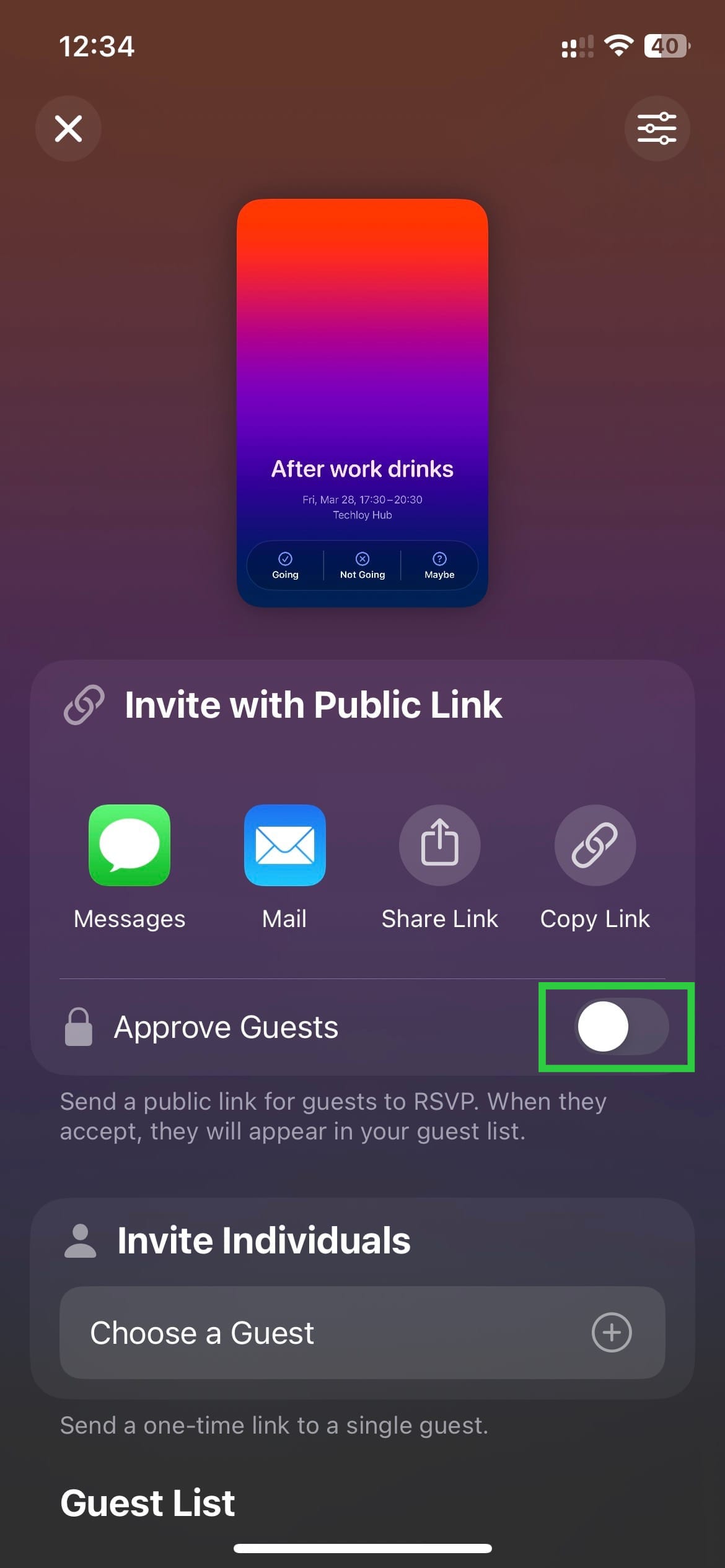 Step 8: Choose how to invite people, and whether to accept them all or approve each. If you want to automatically accept all guests, toggle on Approve Guests.