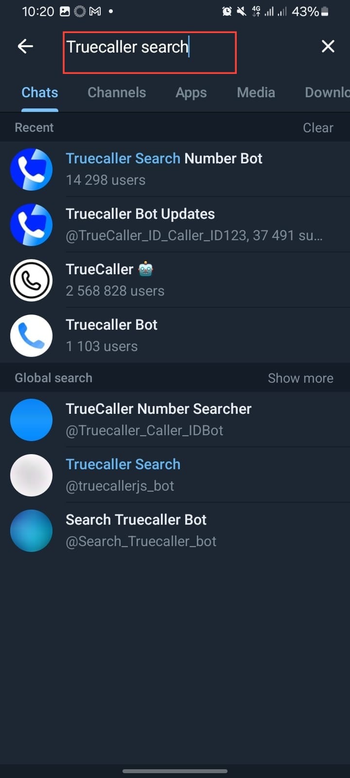 Step 2. In the search bar, type "Truecaller Search Number Bot" and wait for the results to appear.