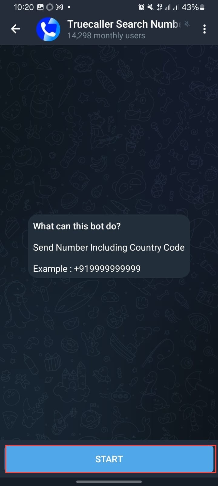 Step 4. In the chat window, press the Start button. The bot will send an automated message prompting you to enter the phone number you want to check.