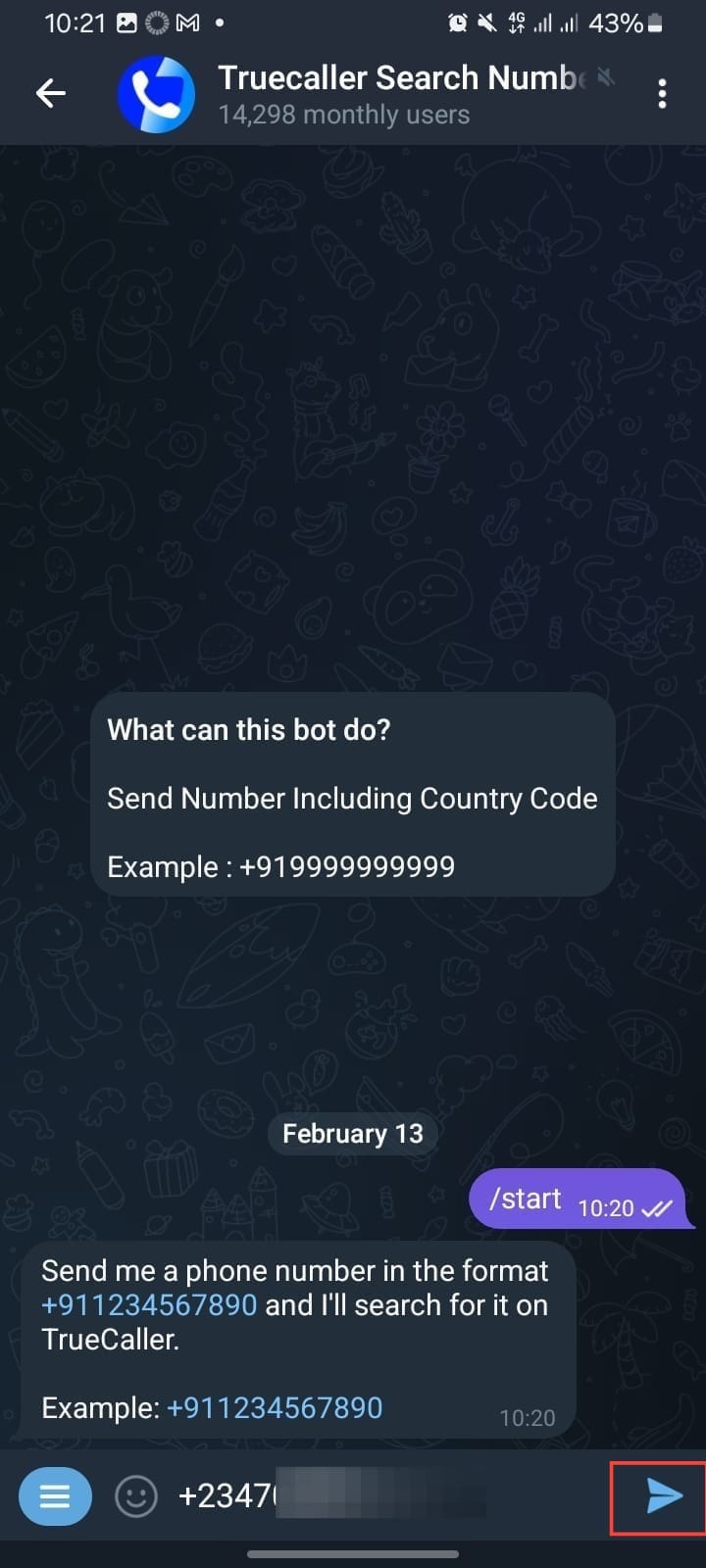 Step 5. Type in the number you want to identify and tap "Send." Be sure to include the country code (e.g., +1 for the U.S., +44 for the U.K.). Without the correct country code, the bot will not recognize the number.