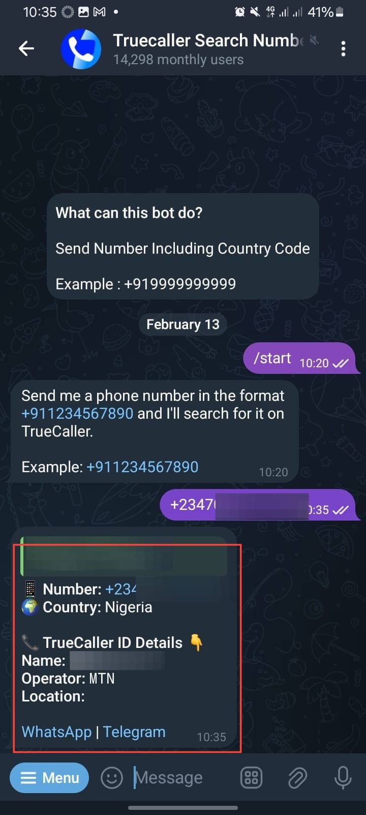 Step 6. After entering the number, wait for a few seconds. The bot will search the Truecaller database and provide details such as the caller’s name, profile, and possible spam reports (if available).