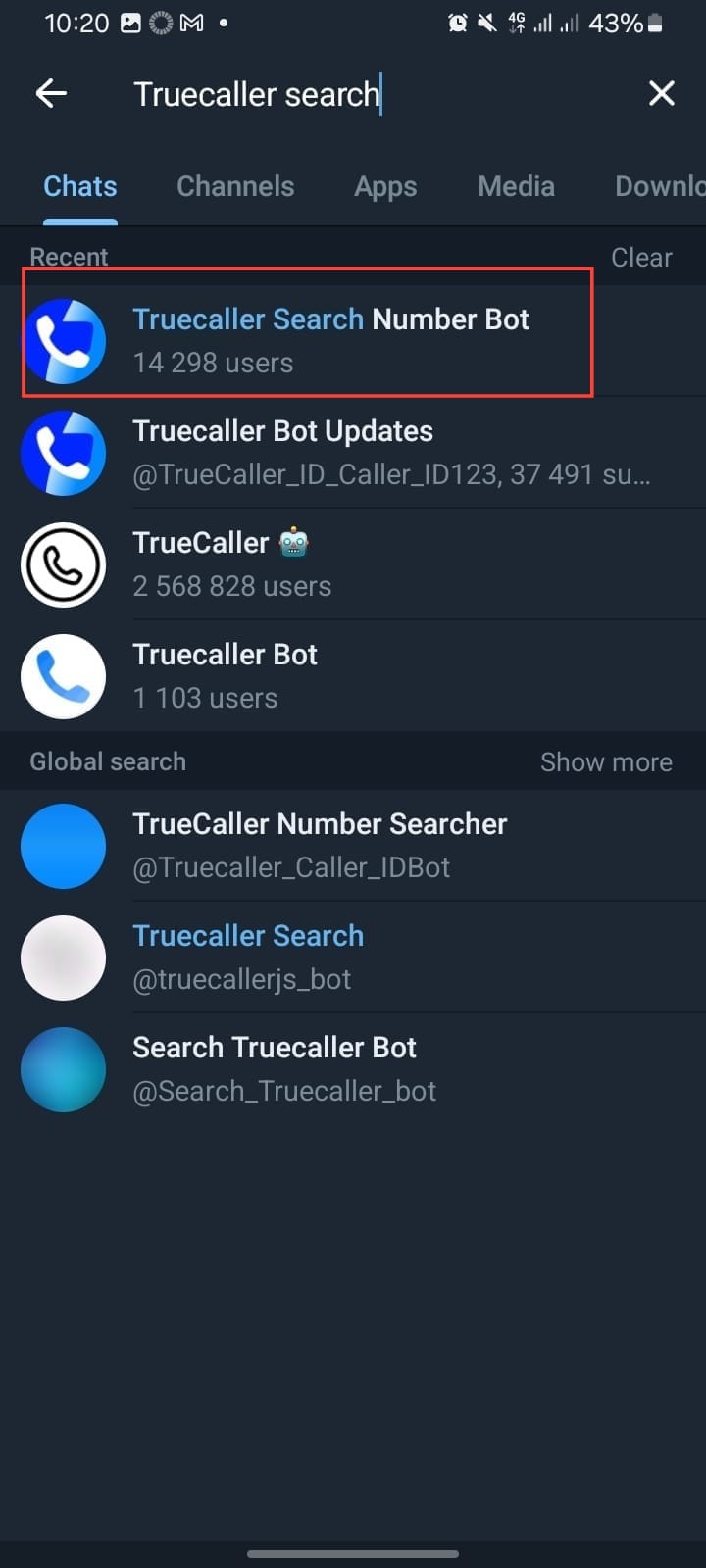 Step 3. Look for the bot with the official Truecaller logo and tap on it. Be cautious not to select a fake bot, as there may be several similar-looking ones.