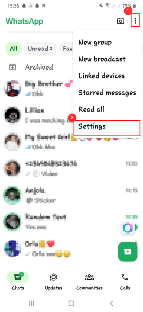Step 1: Open WhatsApp and tap the three-dot menu in the top-right corner and select "Settings"