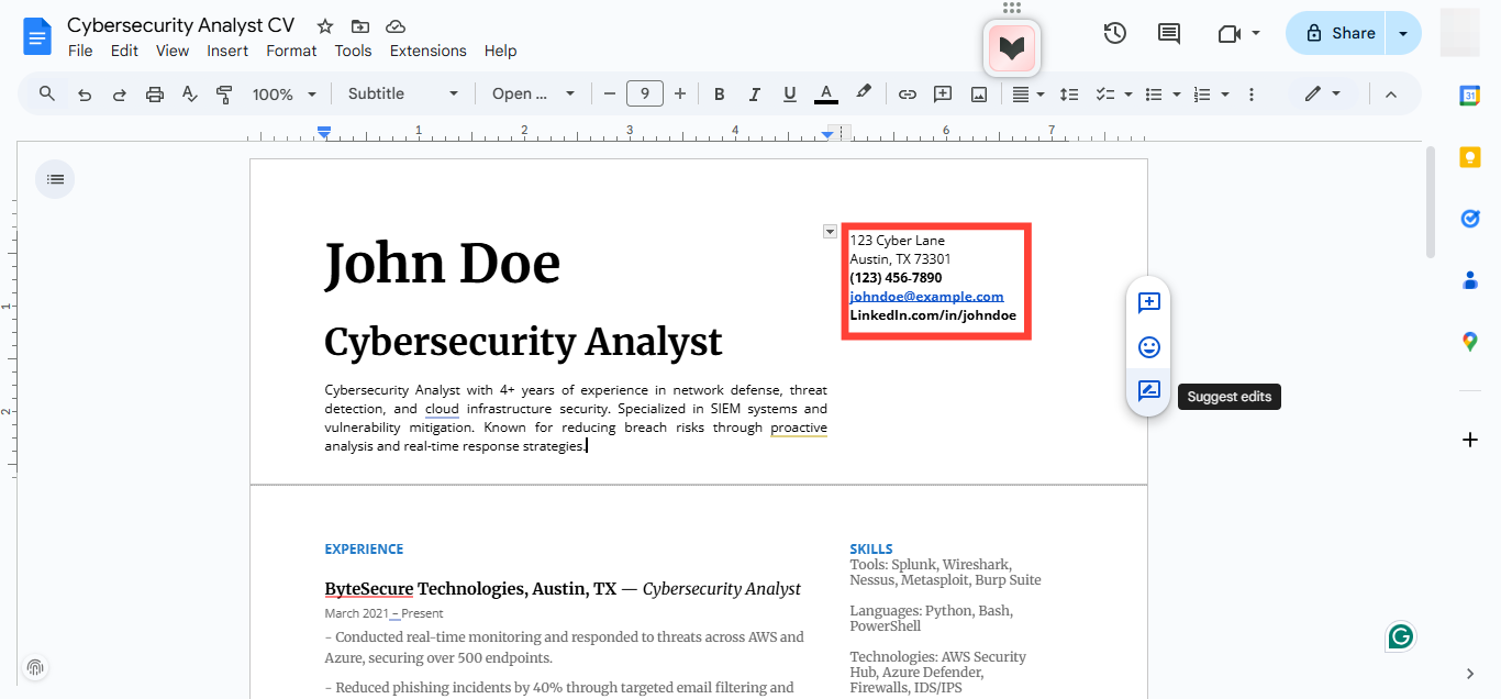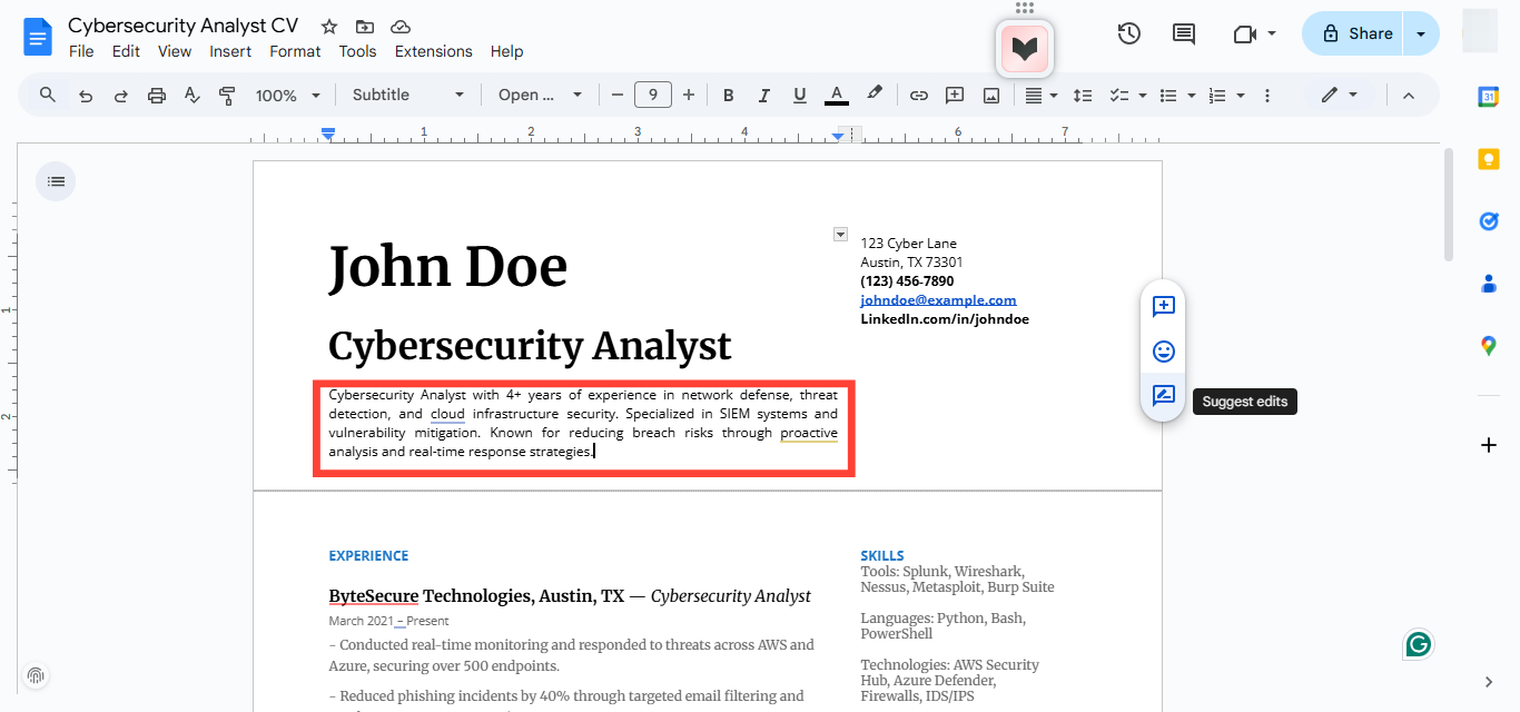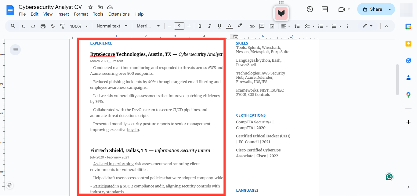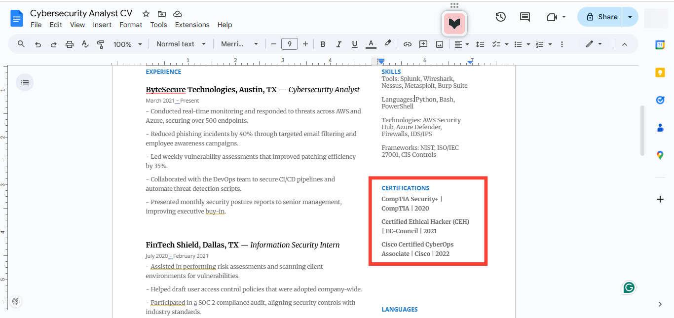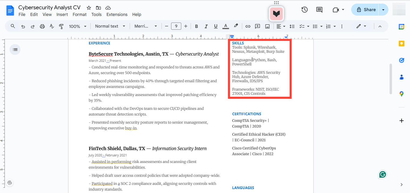 Some roles require you to be hands-on with firewalls and anti-virus software. Others expect you to sit in board meetings and explain security risks to non-technical stakeholders. That’s why your resume needs to be tailored to the specific cybersecurity role you’re aiming for.
