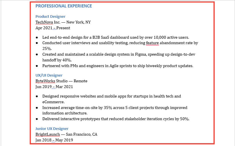 For example, instead of writing a vague line like “Worked on e-commerce product page redesign,” which tells the reader little about your impact, you can opt for something more specific and results-driven, such as: “Redesigned e-commerce product page, reducing bounce rate by 28% and increasing average session duration by 1.5 minutes within 6 weeks.”