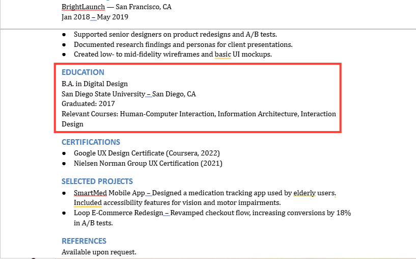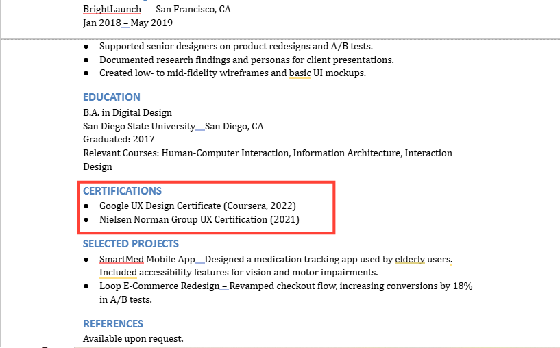If you’ve completed any relevant UX/UI certifications (Google UX Design, Nielsen Norman Group, etc.), include them—especially if you're self-taught or transitioning careers.