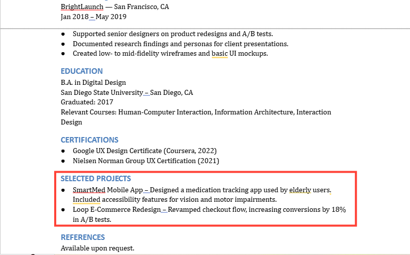 Whether it's freelance work, side projects, or something you built for fun, include 1–2 key projects that show your design thinking in action. Talk about the challenge, your process, and the outcome. If possible, link to a live version or a detailed case study in your portfolio.