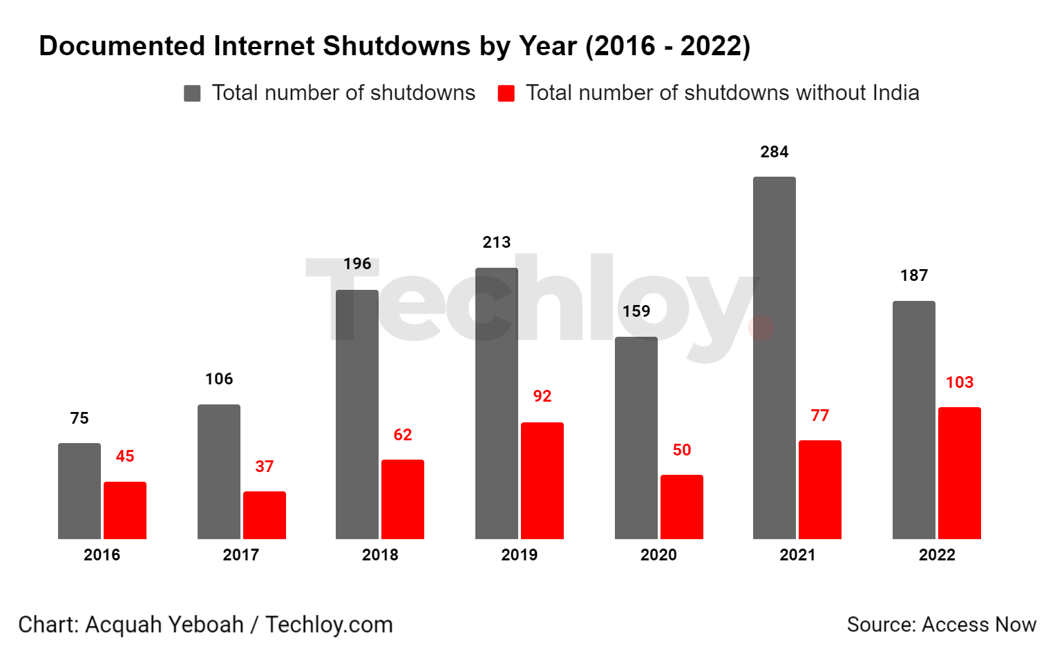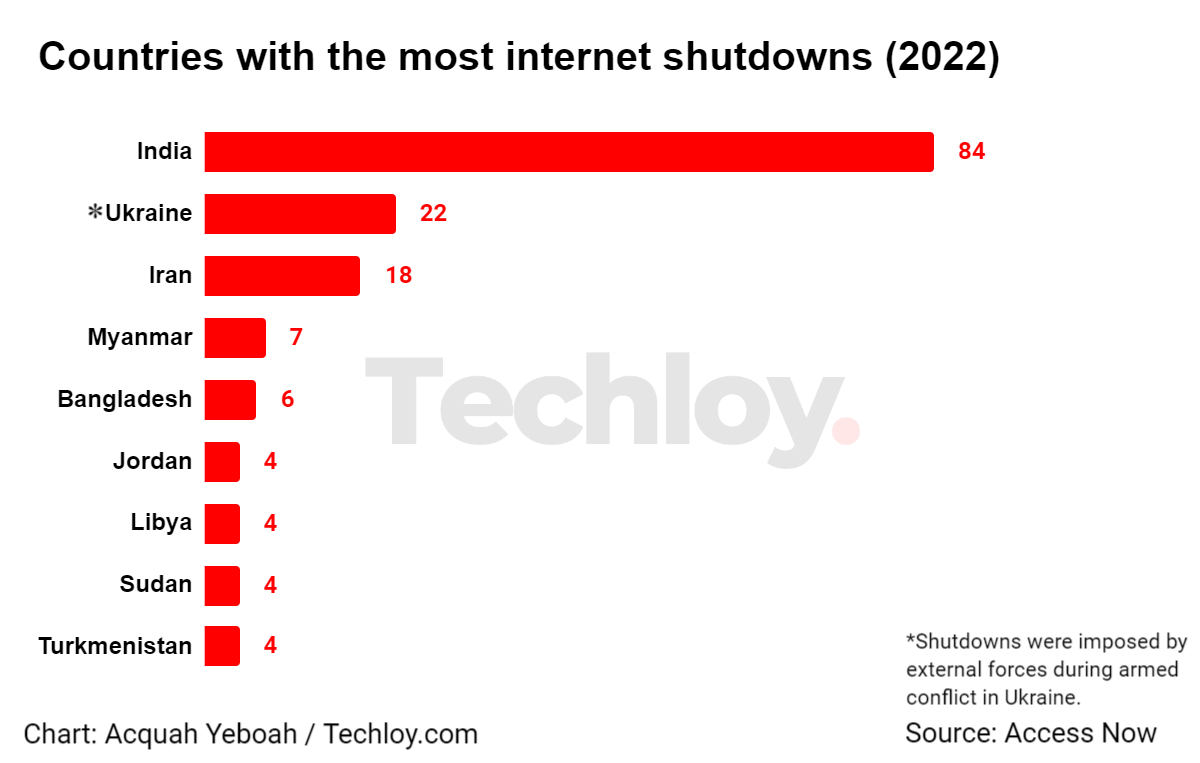 Meanwhile, Ukraine was second on the list, with the Russian military cutting access to the internet at least 22 times after invading Ukraine on February 24, 2022.