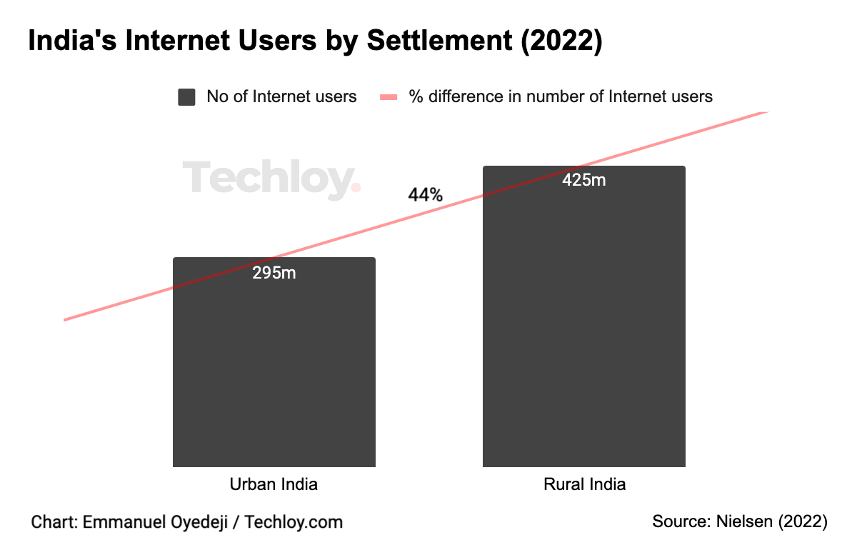 The active internet user base aged 12 years and older grew more than 20% year-on-year to reach 595 million in 2022. The rural area again outshone urban areas with a growth of 30% in the number of active internet users. Urban India, on the other hand, grew by only 10%. Moreover, female users grew by 27%, whereas male users increased by around 18%.