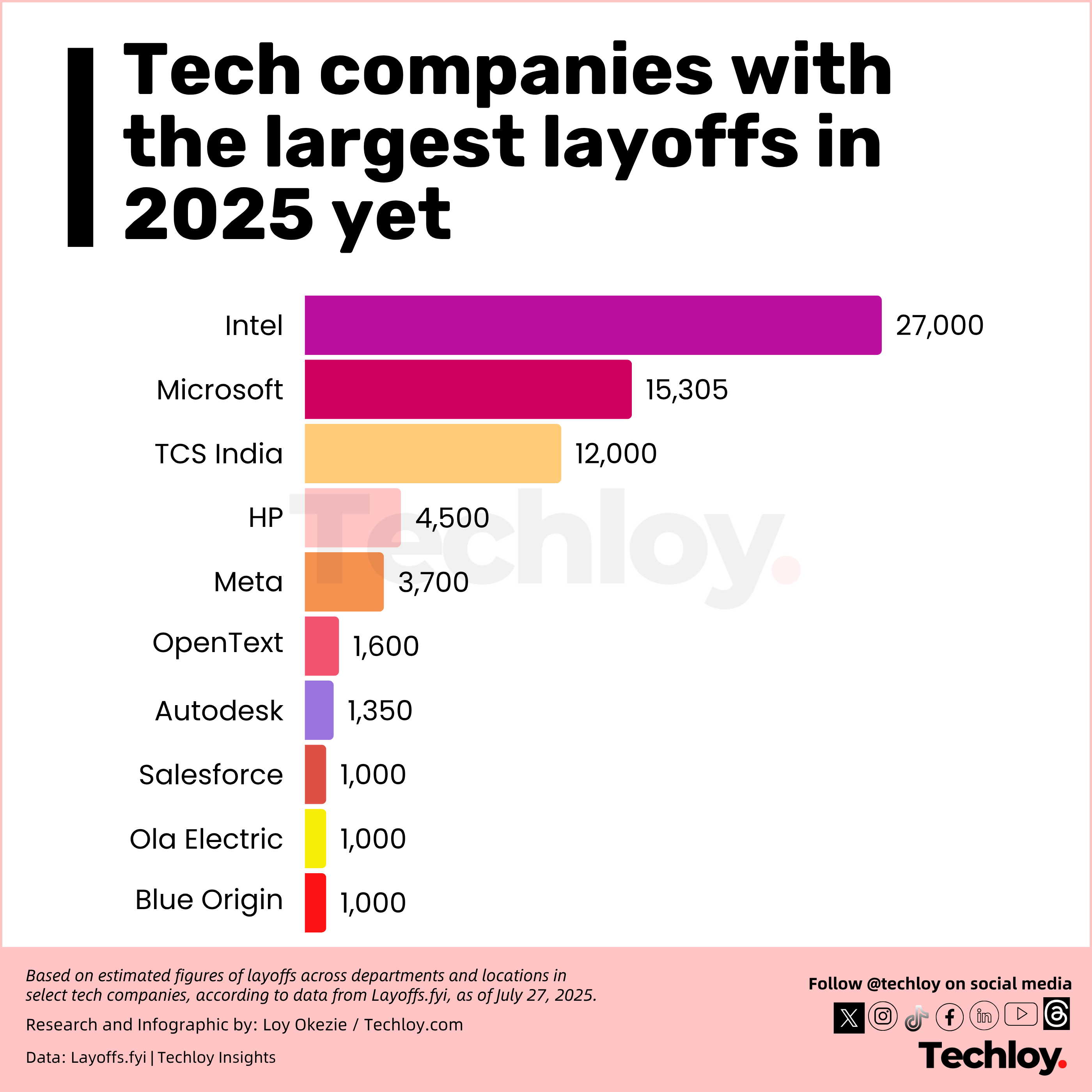 From Intel cutting over 27,000 jobs to Microsoft laying off over 15,000 people so far in 2025, it's a continuation of a pattern we've seen over the last three years in the technology industry globally, which saw over 165,000 jobs cut in 2022, over 264,000 in 2023, and more than 152,000 jobs lost in 2024, per data from Layoffs.fyi. As of July 2025, almost 100,000 layoffs have happened in the tech industry globally.
