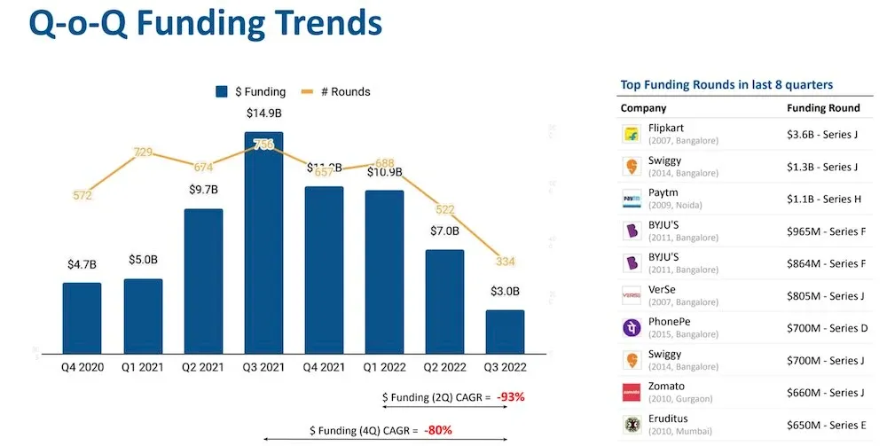With about 334 funding rounds recorded in Q3 2022, down from 674 in the same quarter a year ago, according to the report, the Indian startup ecosystem, which appeared to be the darling of VC funding in Asia, is now experiencing a major funding crunch.