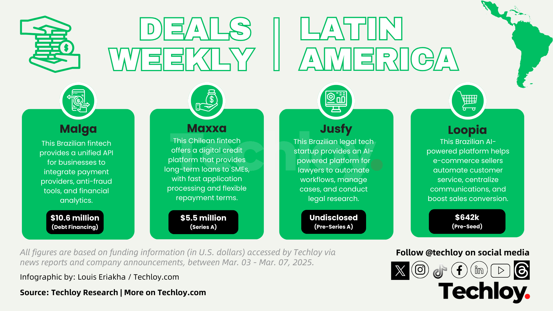 Leading the week’s funding was Maxxa, a Chilean fintech that raised $10.6 million in debt financing from Symbiotics and Delphos. Maxxa’s digital credit platform offers long-term loans to small and medium-sized businesses in Chile, processing applications within minutes and offering repayment terms of up to three years. The company will use the funds to expand its SME lending operations and improve its credit evaluation platform. Since its founding in 2009, Maxxa has helped over 5,000 users finance their businesses, providing more than $55 million in loans to Chilean SMEs.
