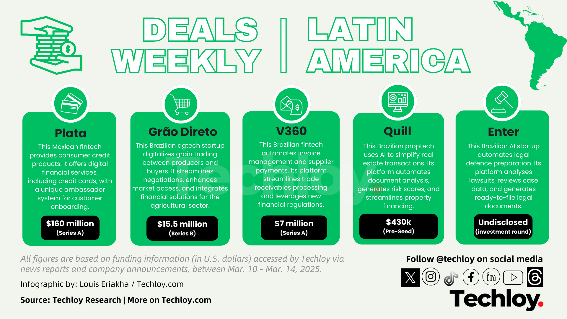 Leading the week was Plata, a Mexican fintech that raised $160 million in a Series A round, reaching a $1.5 billion valuation. The company, which recently secured a banking license, focuses on consumer credit products and has one million active credit card users. The round was led by Kora, with participation from Moore Strategic Ventures and other investors.
