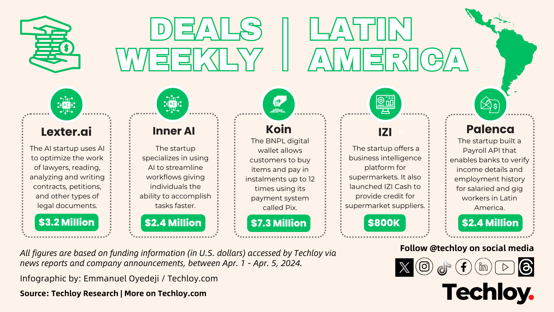 Here are the venture funding activities we tracked in the Latin American region this week – Lexter.ai, Inner AI, Koin, IZI, and Palenca.