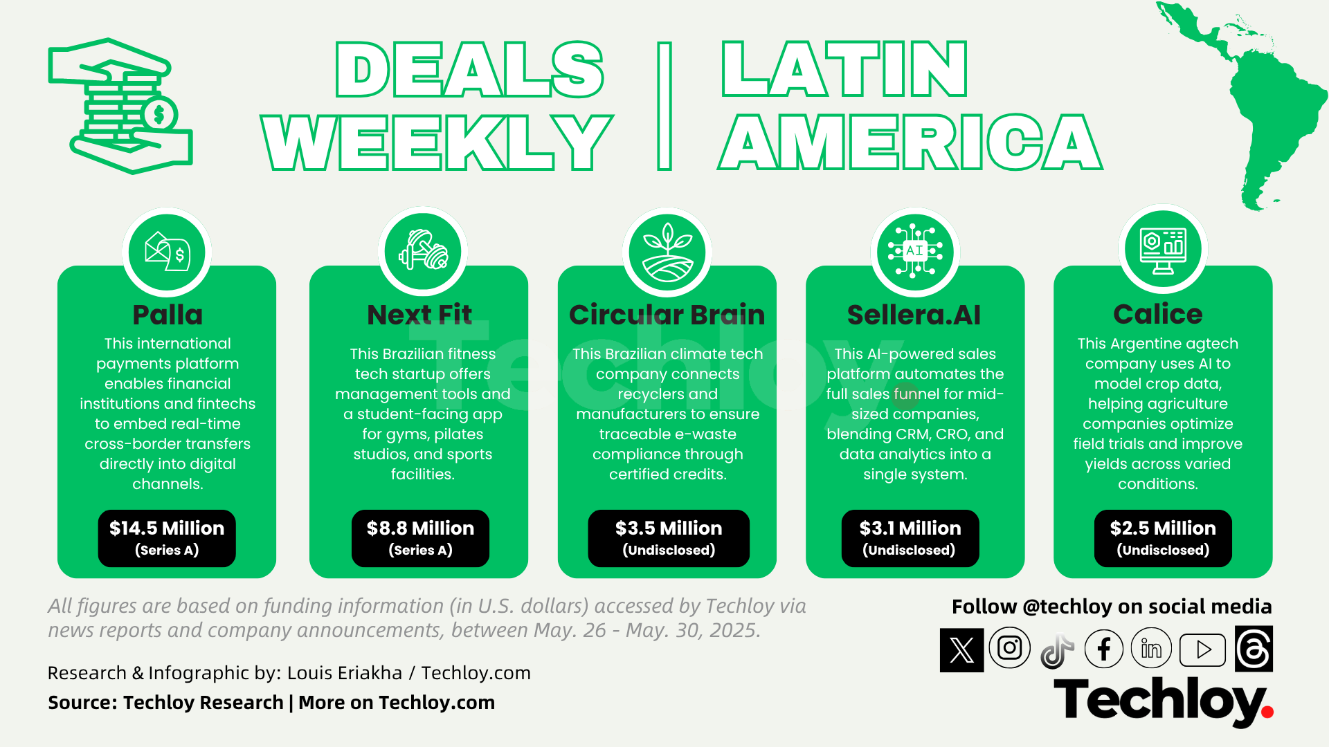 In this week's funding deals, we tracked Palla, Next Fit, Circular Brain, Sellera.AI, and Calice in the LatAm region.