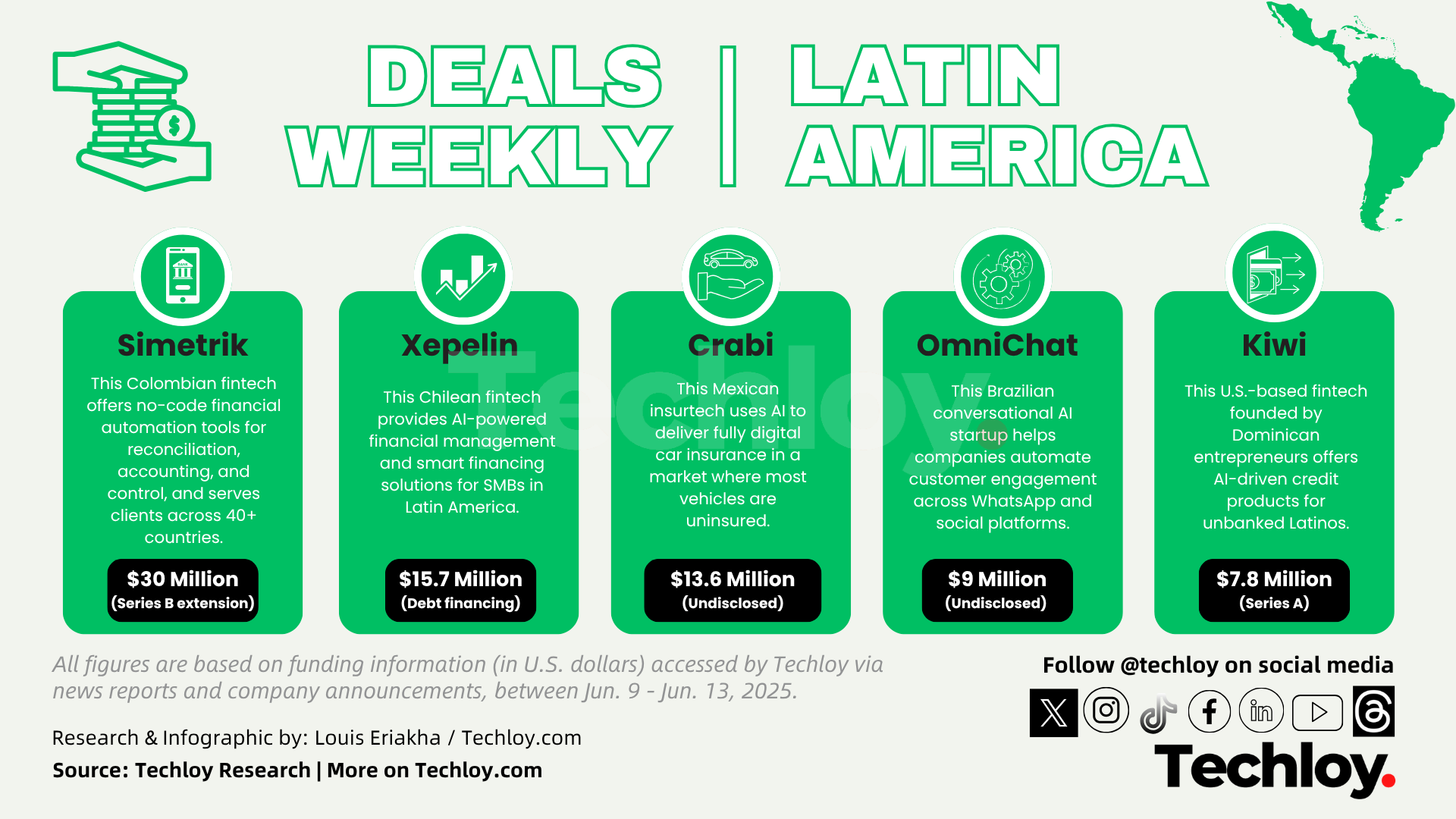 In this week's funding deals, we tracked Simetrik, Xepelin, Crabi, OmniChat, and Kiwi in the LatAm region.