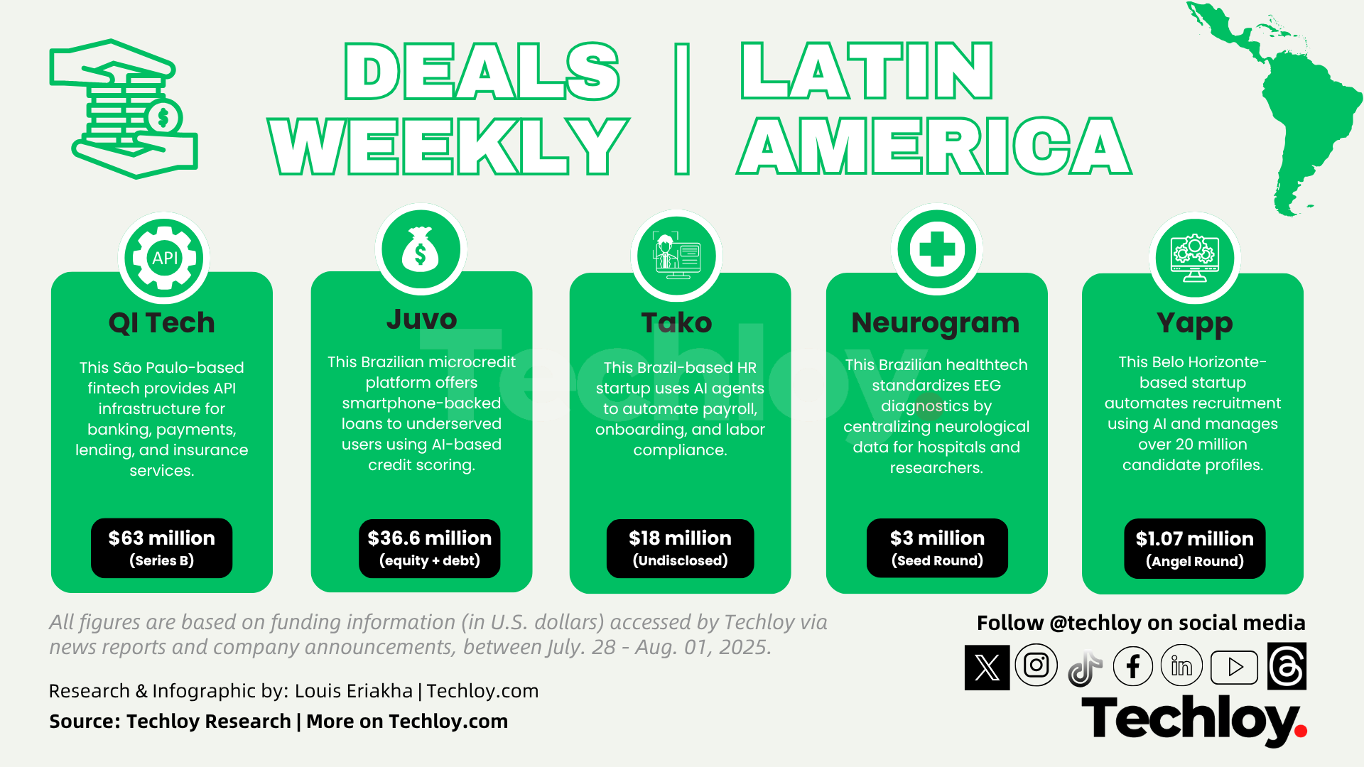 In this week's funding deals, we tracked QI Tech, Juvo, Tako, Neurogram and Yapp in the LatAm region.