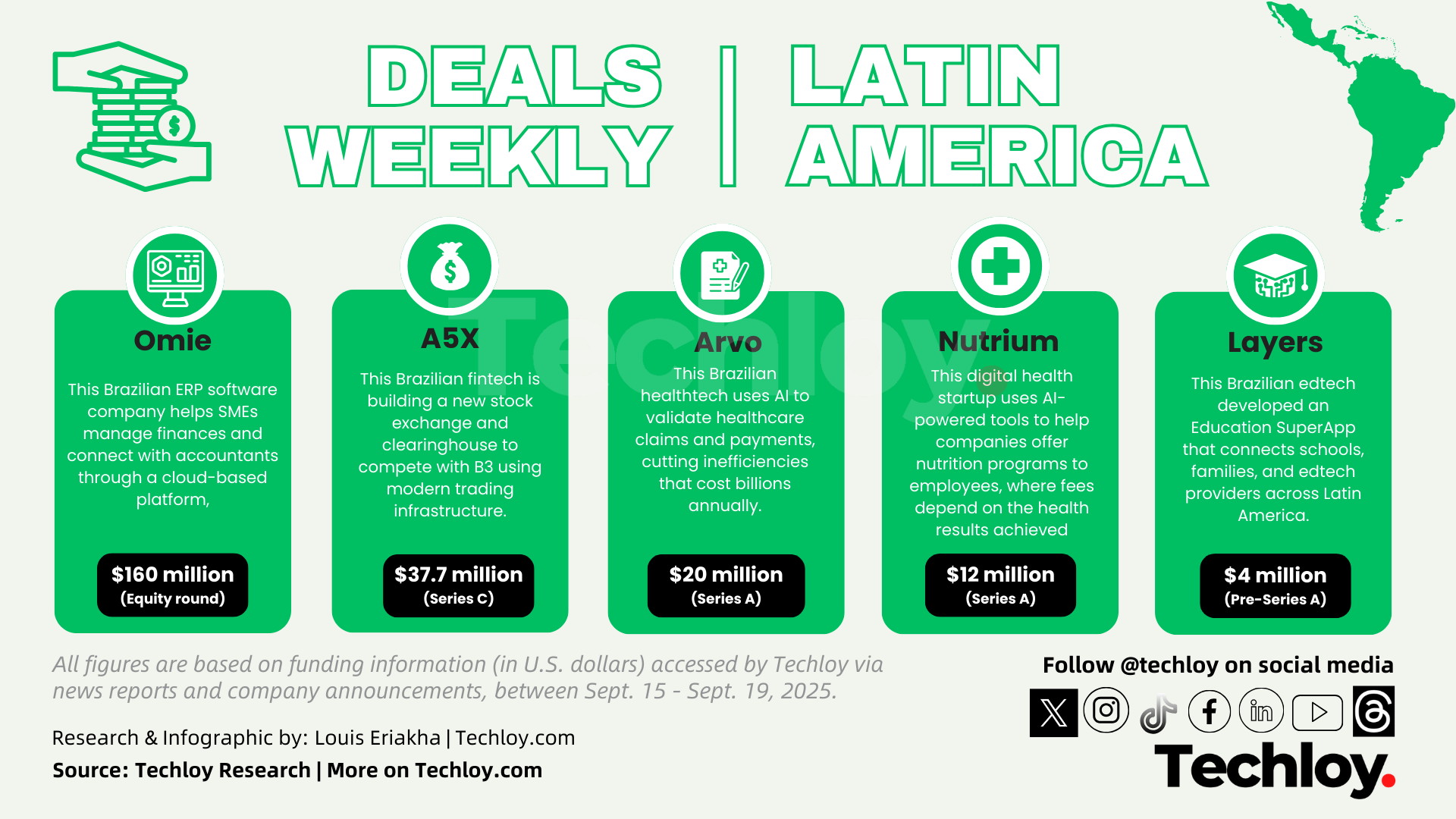 Brazilian ERP software provider Omie led the week with a $160 million round backed by Partners Group. While most of the deal was secondary—allowing early investors to partially exit—an undisclosed portion went directly to the company as primary capital. Founded in 2013, Omie offers cloud-based ERP and financial services for small and medium-sized businesses, connecting them with accounting firms through consultant-led adoption. The company reports $112 million in annual recurring revenue, has been cash-flow positive since mid-2023, and serves 180,000 customers while processing over $6.5 billion in monthly invoices, growing 30–40% annually.