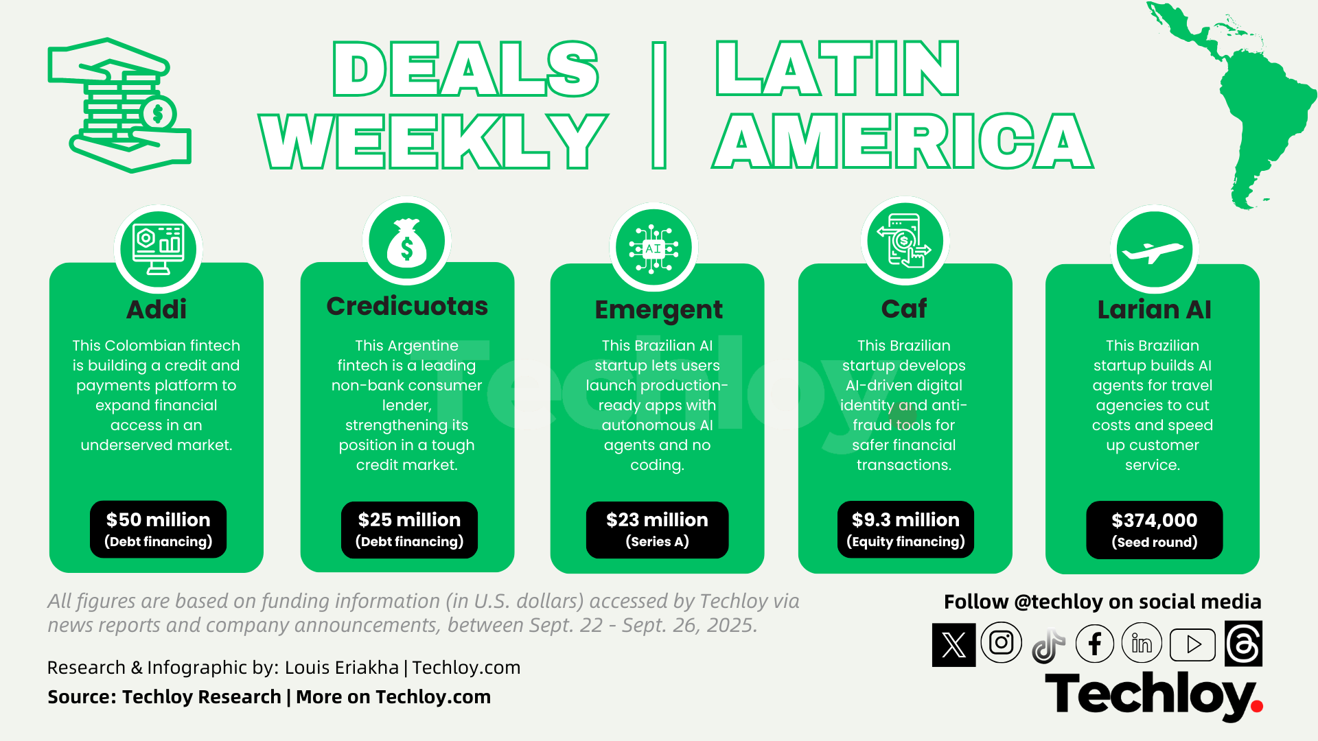 In this week’s funding deals, we tracked Addi, Credicuotas, Emergent, Caf, and Larian AI in the LatAm region.