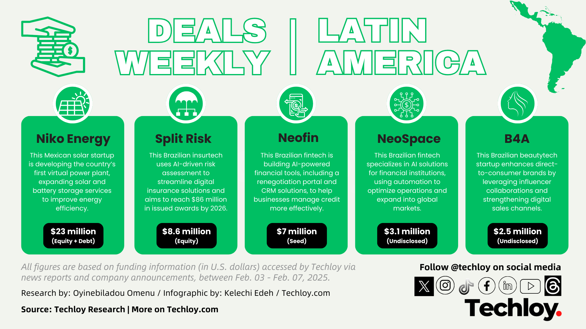 Brazilian fintech Neofin also secured $7 million in a seed round led by Quona and Upload. The investment will fuel the development of new modules, including an AI-powered renegotiation portal and CRM tools while expanding their tech and data teams. Meanwhile, another Brazilian fintech NeoSpace raised $3.1 million in a round led by Itaú, which contributed $2.5 million. NeoSpace, specializing in AI solutions for financial institutions, plans to expand its services and enter international markets.