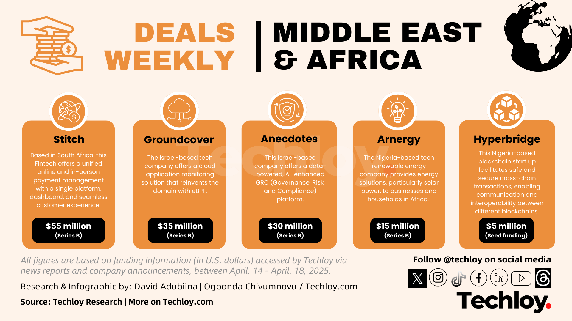 Here are the venture funding activities we tracked in the Middle East and African region this week – including Stitch, Groundcover, Anecdotes, Arnergy, Hyperbridge, Sadq, TruBuild, Zimi, and Rabbit.