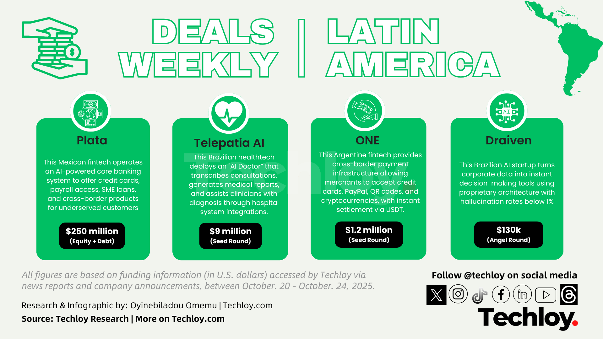 Mexican fintech Plata led the week with a $250 million funding round that pushed its valuation to $3.1 billion, making it one of Latin America’s fastest-growing neobanks. Founded in 2023 by Neri Tollardo and Danil Anisimov, Plata operates a proprietary, AI-powered cloud banking system built to serve Mexico’s underbanked population. The platform currently provides flexible credit cards and transparent lending products, but plans to expand into payroll access, debit accounts, SME loans, and cross-border services. With over two million active users and a growing workforce of 3,000 employees, Plata now issues nearly 10% of all new credit cards in Mexico.