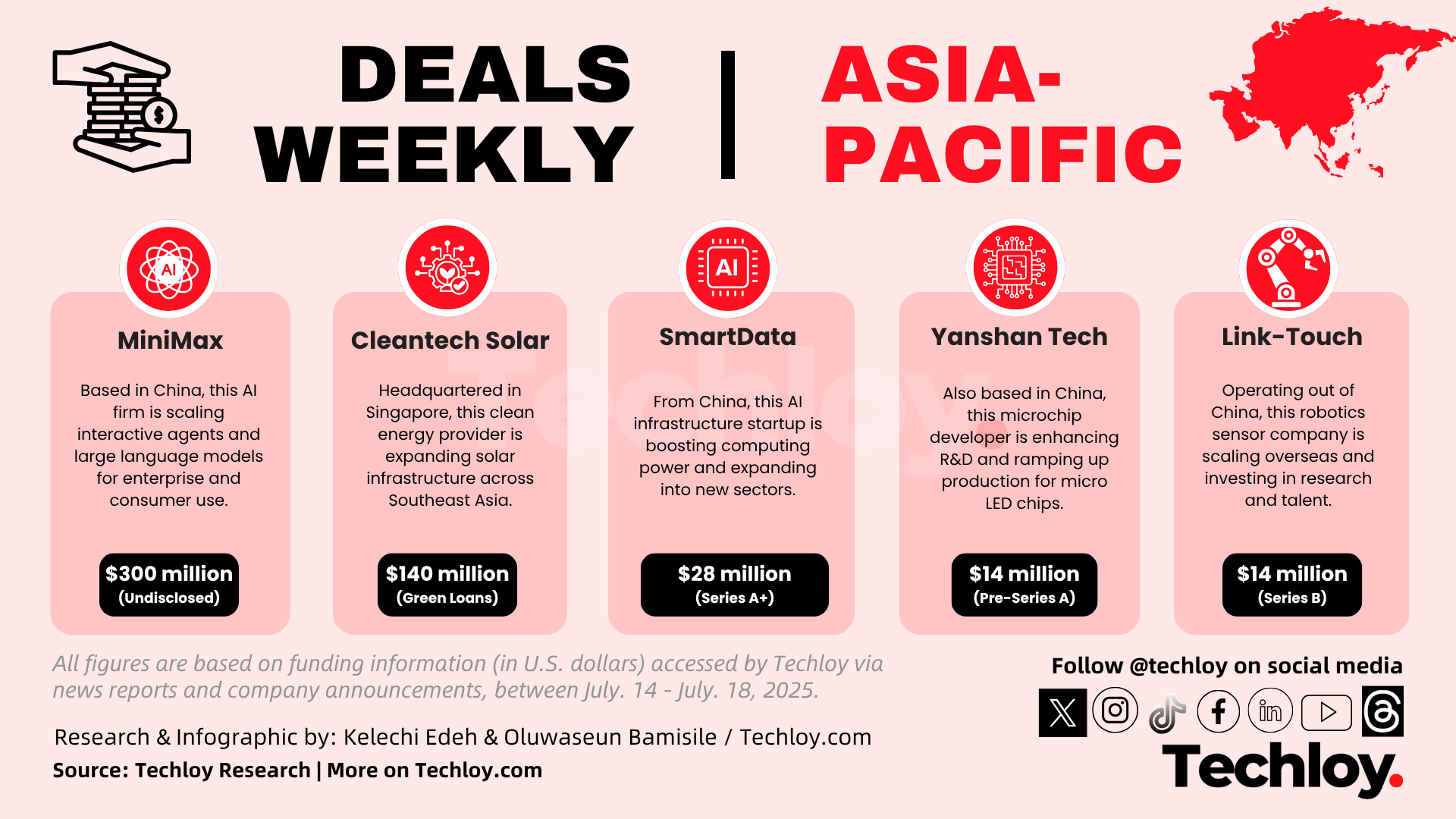 China's SmartData, an AI infrastructure provider, raised $28 million in a Series A+ funding round to scale its AI computing power and expand into new sectors. Meanwhile, Yanshan Technology, a micro-LED chip developer also in China, raised $14 million in a pre-Series A round to enhance chip R&D and ramp up production capabilities.