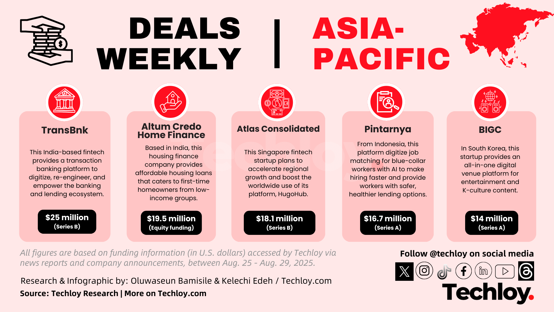 Funding momentum across Asia stayed strong this week, with over $137 million flowing into startups across fintech, housing finance, AI, hospitality, and consumer brands. India, Singapore, South Korea, Indonesia, and Malaysia all featured prominently, showing the region’s diverse innovation landscape.
