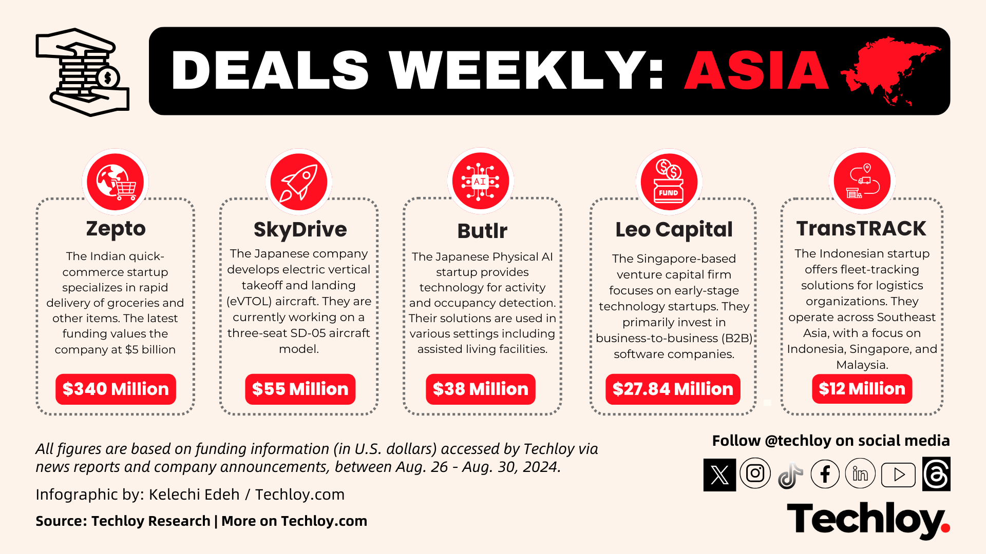 These are the funding deals we tracked in the Asian region this week – including Zepto, SkyDrive, Butlr, TransTRACK, and Leo Capital.