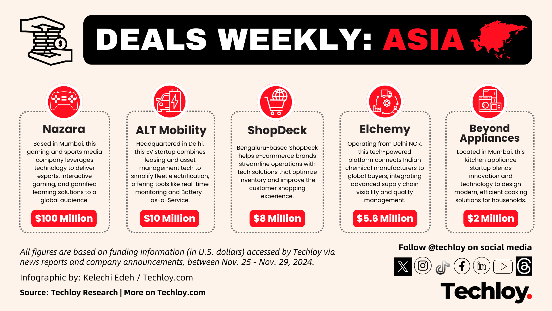 - ShopDeck, based in Bengaluru, raised $8 million to optimize its e-commerce technology platform for retailers and brands.