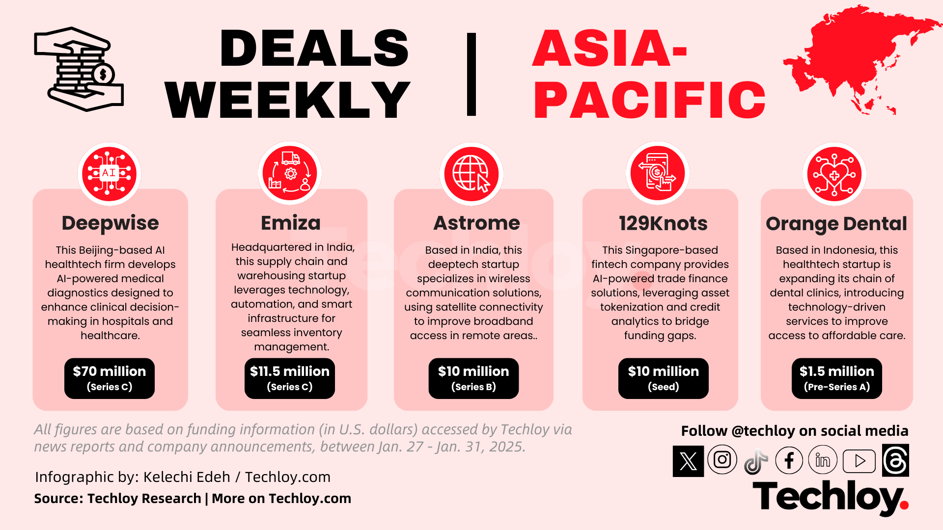 These are the funding deals we tracked in the Asian region this week – featuring Deepwise, Emiza, Astrome Technologies, 129Knots, and Orange Dental.
