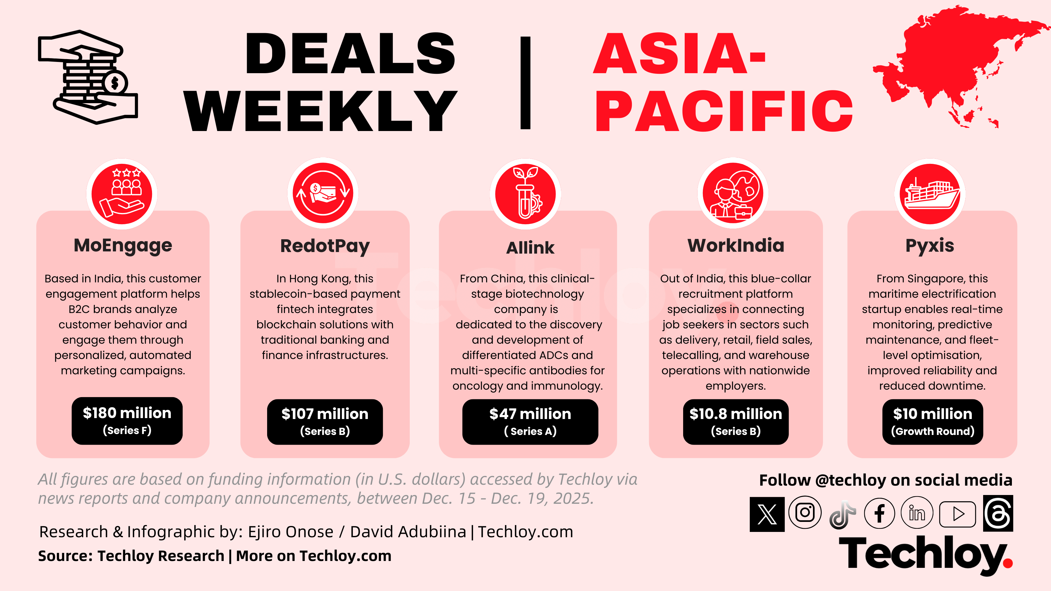 These are the funding deals we tracked in Asia this week—featuring MoEngage, RedotPay, Allink Biotherapeutics, WorkIndia, Pyxis, Tagbin, Magma, and an AI cybersecurity startup.