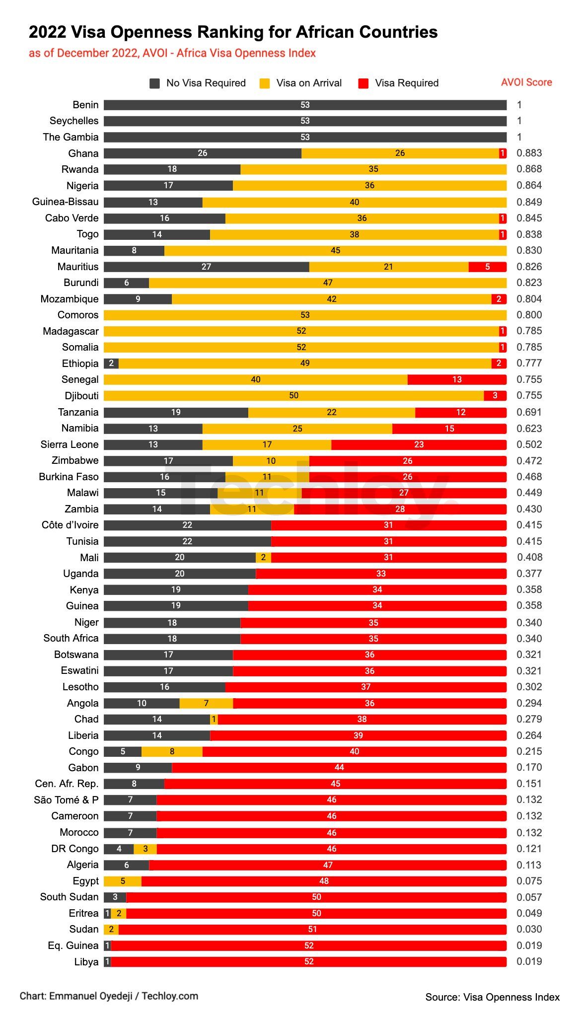 It is worth noting that a significant majority of African countries now offer visa-free travel to nationals of at least five other African countries in 2022. In contrast, 32 countries still require the nationals of at least half of the continent’s countries to obtain a visa before travelling, as the Techloy infographic below shows.