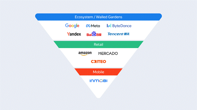 At the top are walled gardens and super-app ecosystems. These platforms own the full funnel: from attention to action. Their AI trains on first-party behavioral data across search, social, video, maps, and payments. They don't track users across the web — they keep them inside.