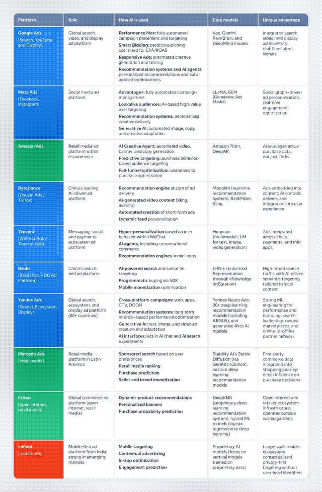 The platforms below show how this plays out in practice. While their structures differ — from search and social to commerce and super-app ecosystems — they are converging on the same model: AI as the core decision engine behind advertising.