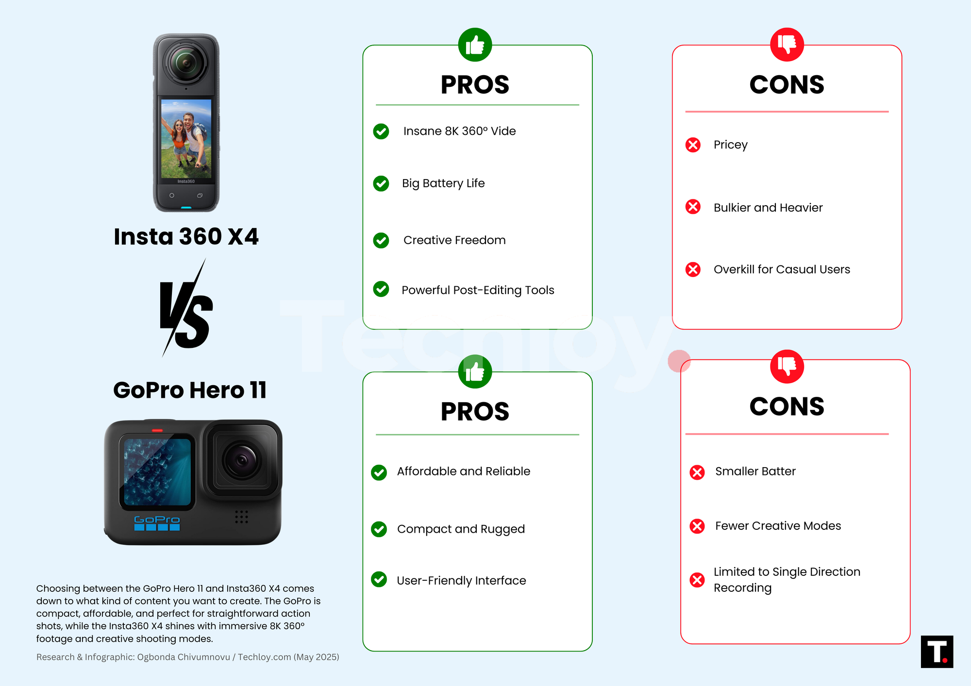 GoPro Hero 11 is perfect for straightforward, action-packed shooting—lightweight, budget-friendly, and super stable. Insta360 X4, though pricier, gives you unmatched creative flexibility with 360° capture and 8K video. Choose GoPro for simplicity, Insta360 for next-level versatility.