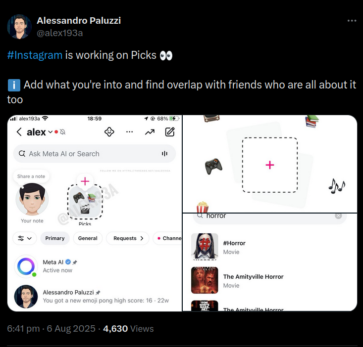 The company is reportedly working on a feature called “Picks” that’s designed to help users discover shared interests with friends. First spotted by reverse engineer Alessandro Paluzzi, Picks is still just an internal prototype and isn’t being tested publicly. But from the screenshots he shared, the idea is straightforward. You choose your favourite movies, books, TV shows, games, and music, and Instagram shows you which friends share your tastes.