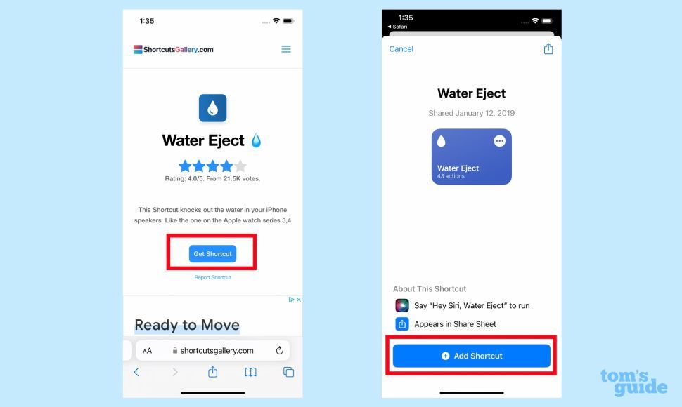 To access the shortcut, simply open your iPhone's browser and go to the Shortcuts Gallery (which opens in a new tab). From there, click "Get Shortcut" and then "Add Shortcut" on the following screen. Once you've done this, you can use the Water Eject shortcut in a variety of ways.
