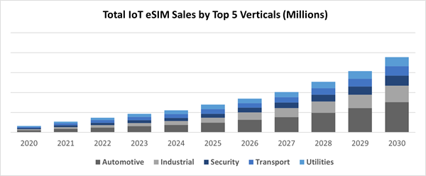 In the report, eSIM (including iSIM) is expected to account for more than 50% of the total IoT module sales in 2023. The sales of eSIMs for IoT applications will grow from 190 million in 2022 to 978 million by 2030 at a CAGR of 23%.