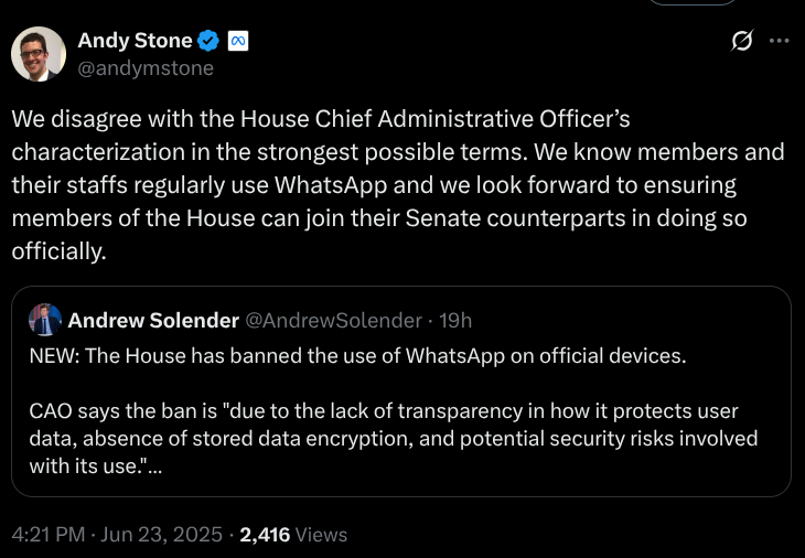 Well, as expected, Meta didn’t take that quietly. Their communications director, Andy Stone, responded almost immediately on X (formerly Twitter), saying the company disagrees with the House’s decision. And to be fair, he makes a point, WhatsApp does offer end-to-end encryption by default, so even Meta can’t see your messages. In a bid to prove his point, he compared WhatsApp's level of protection with the approved apps, which WhatsApp supposedly supersedes.