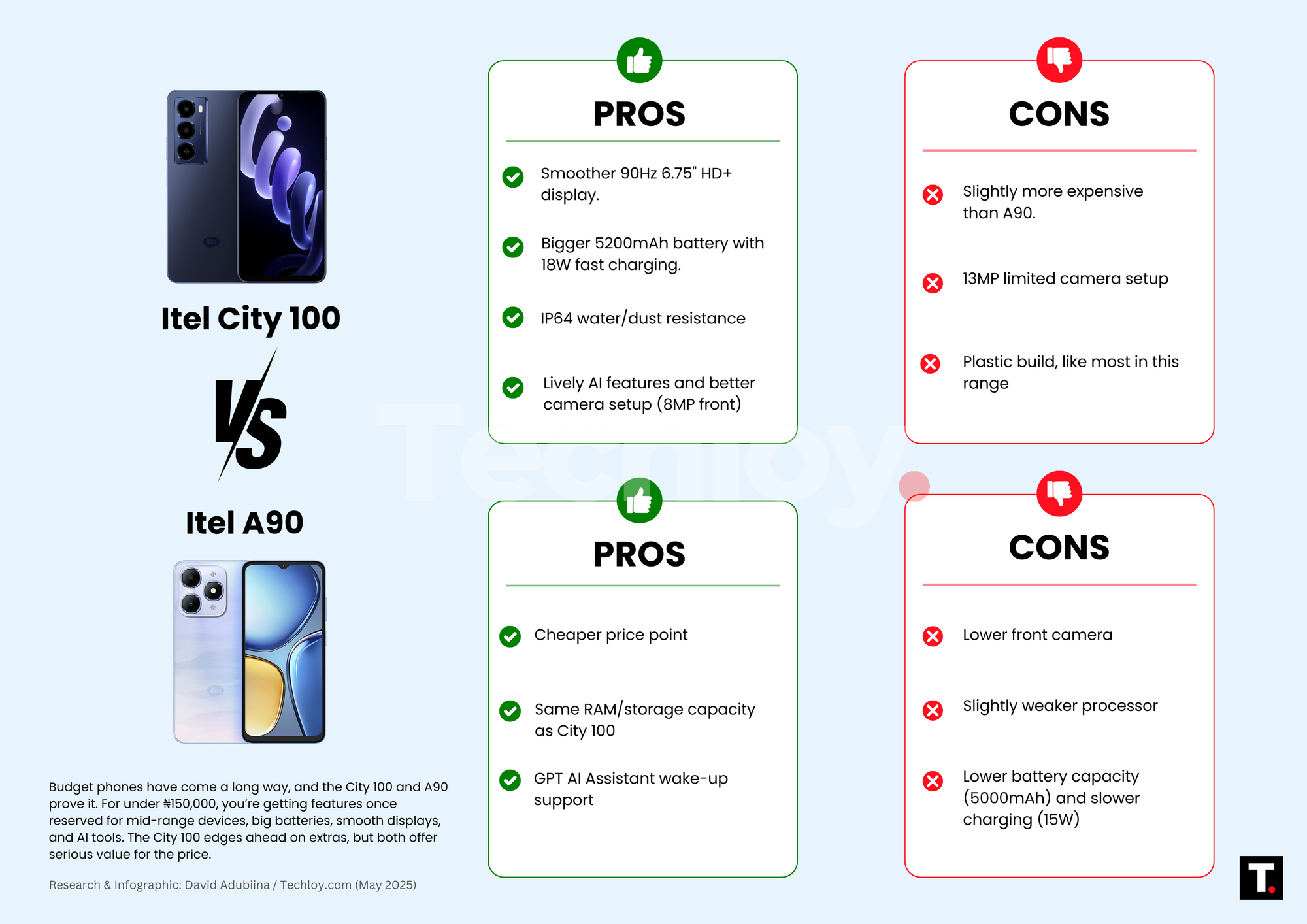 The Itel City 100 is priced at ₦115,480, while the A90 comes in slightly lower at ₦102,496.