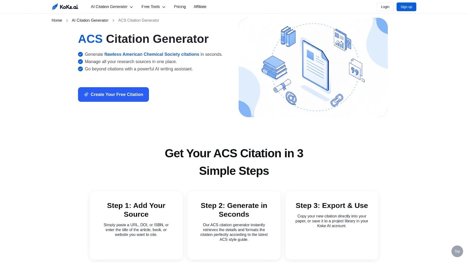Koke AI Citation Generator is an advanced tool that helps you create professional citations right away. If you need ACS citation generator options or want to format your references in APA, Koke AI makes the process smooth and super easy for students and researchers.