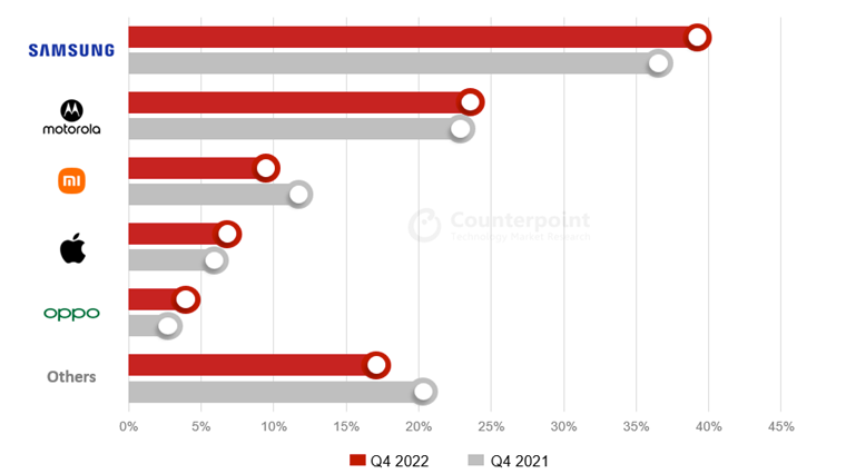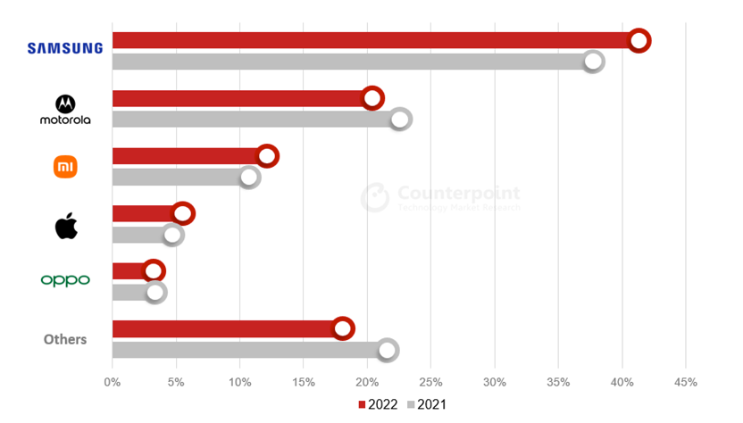 Motorola’s market share was only half of Samsung's market share. Shipment volume and share declined as the brand’s entry-level models were in short supply. Xiaomi’s market share and volume also declined YoY in 2022. The brand marked its lowest volume since Q1 2021.