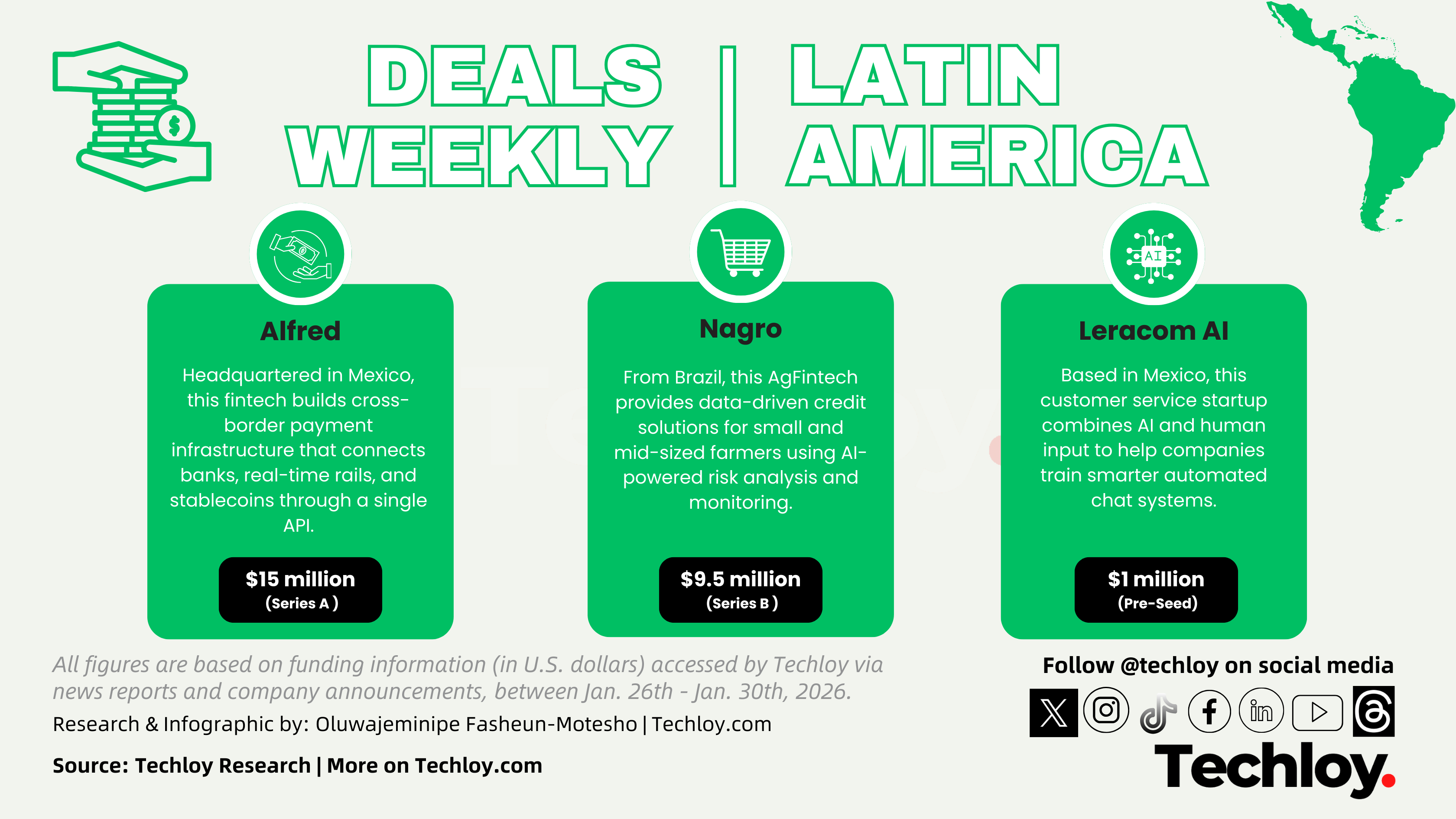 Startups across Latin America raised a combined $25.5 million this week, based on disclosed funding rounds tracked by Techloy, with investor capital flowing mainly into fintech infrastructure and credit-focused platforms. A small number of mid-stage deals made up most of the funding activity during the week.