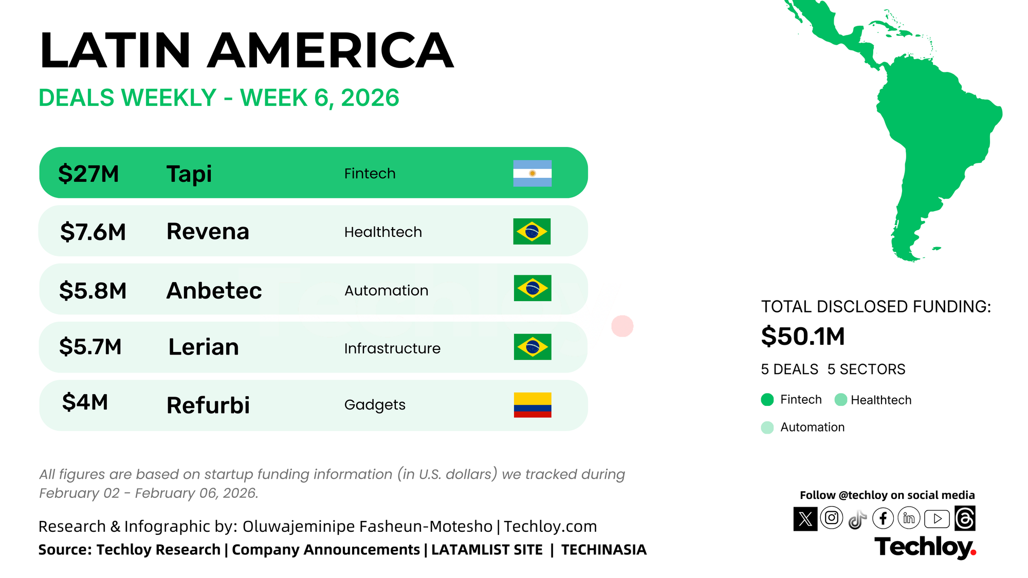 With $50.1 million in disclosed funding this week, investor focus in Latin America remains strongly centered on fintech and financial infrastructure, especially platforms supporting payments, credit, and automation. At the same time, healthtech and circular economy startups continue to attract steady early-stage capital, showing a balanced mix of core financial systems and emerging impact-driven technologies.
