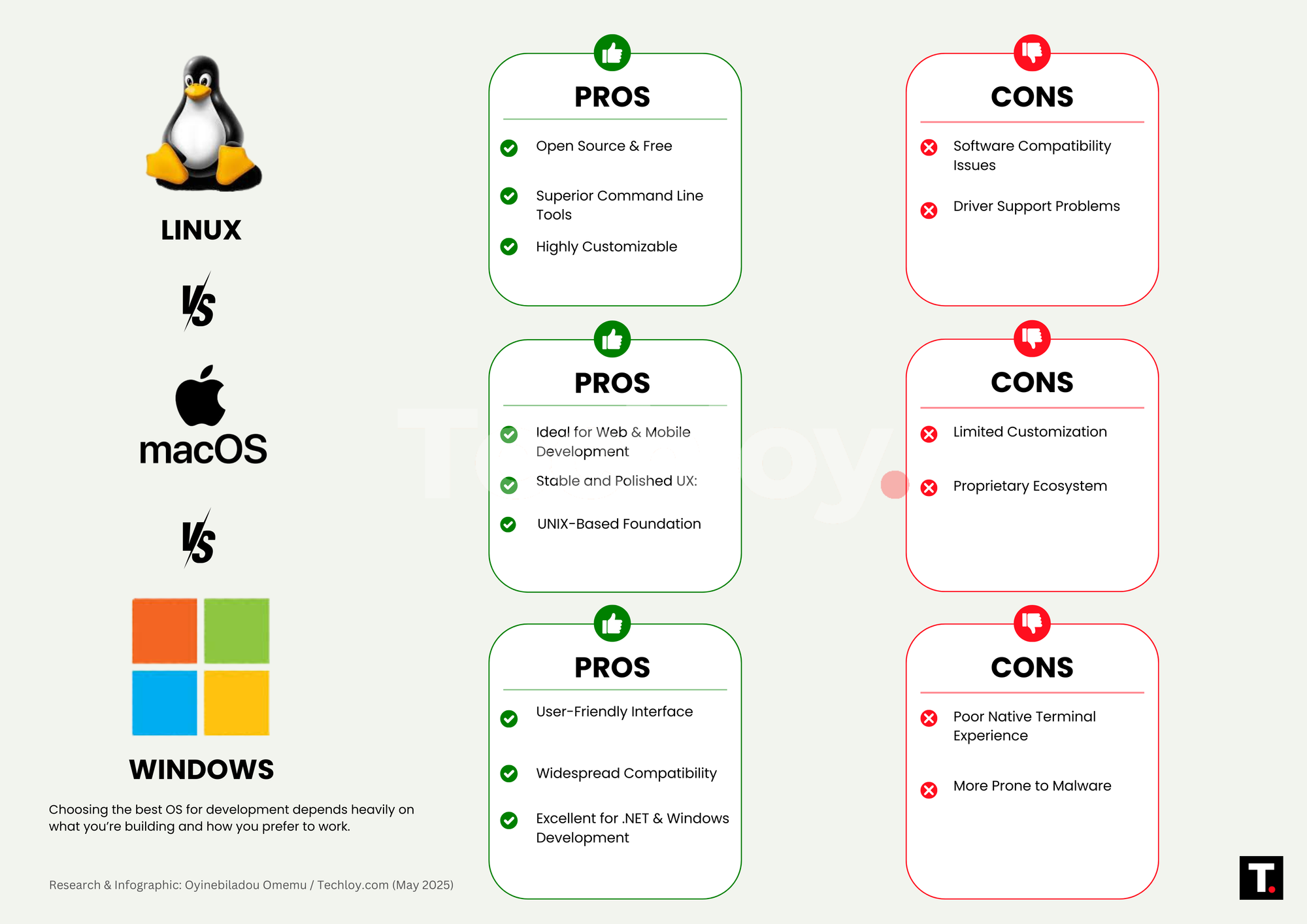 Choosing the best OS for development depends heavily on what you’re building and how you prefer to work. Choose Linux if you value flexibility, open-source tools, and full control over your environment. It’s ideal for server-side development, DevOps, scripting, and anything requiring robust CLI tools.