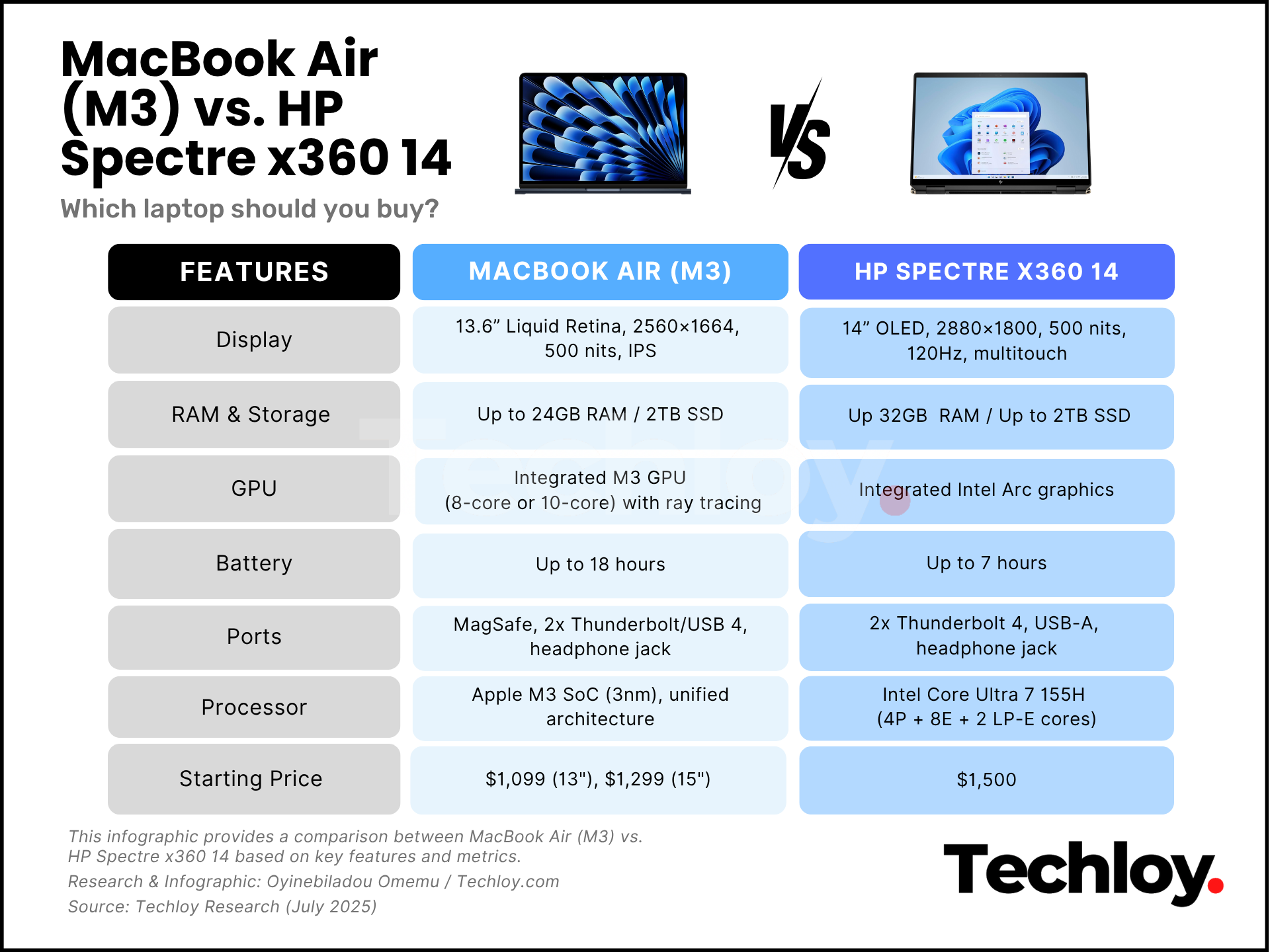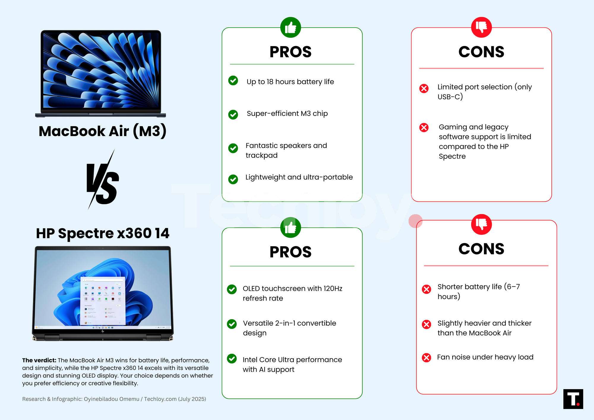 It’s not an easy call. The MacBook Air (M3) delivers peak portability and battery life, while the HP Spectre x360 14 brings convertible versatility, an OLED display, and cutting-edge Intel performance. Both are excellent in their own right, but depending on your needs, one will fit better than the other.