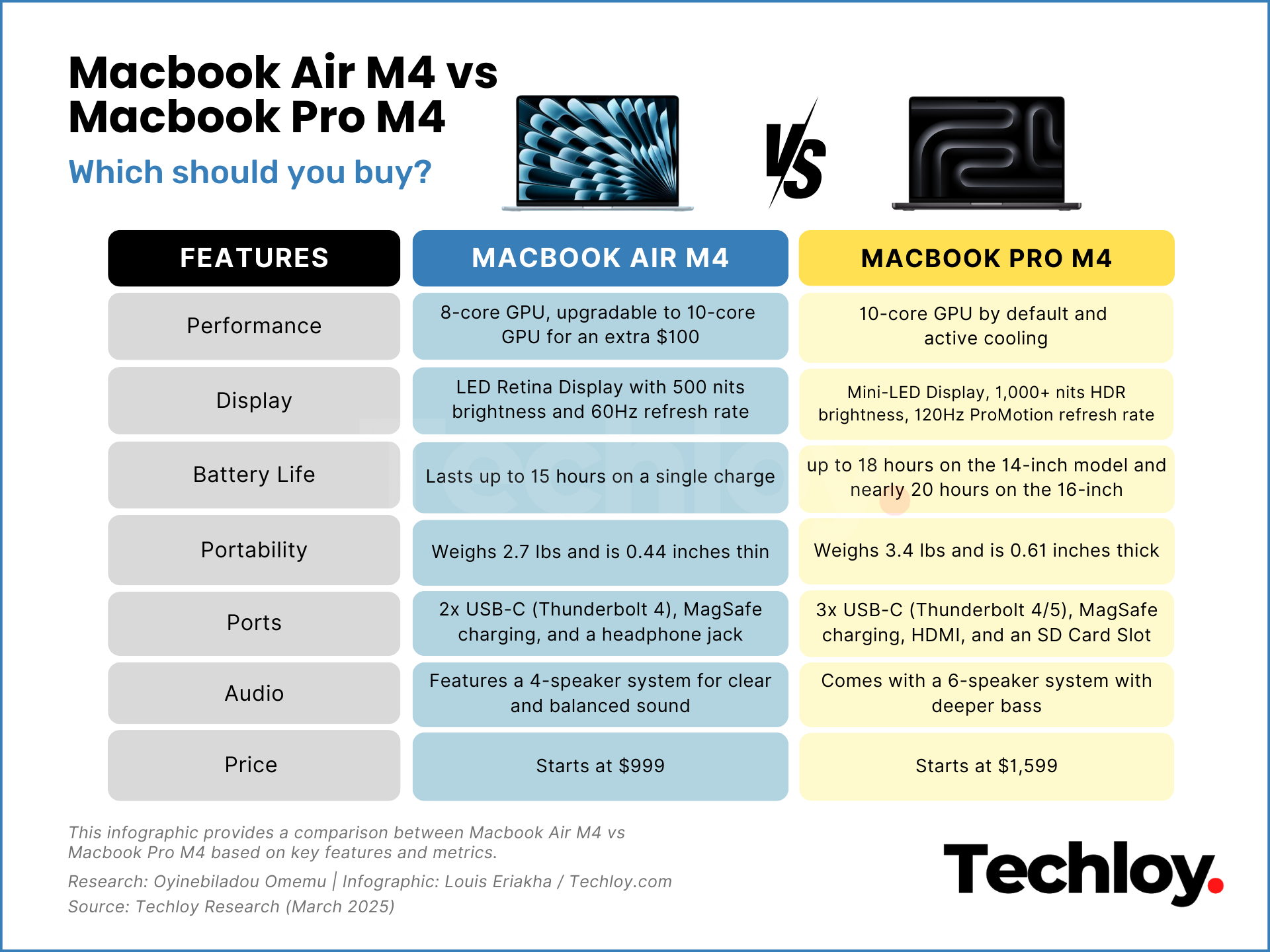 - MacBook Air M4 costs $999, making it a great budget-friendly option for everyday users. If you’re price-conscious, the MacBook Air is perfect for you.