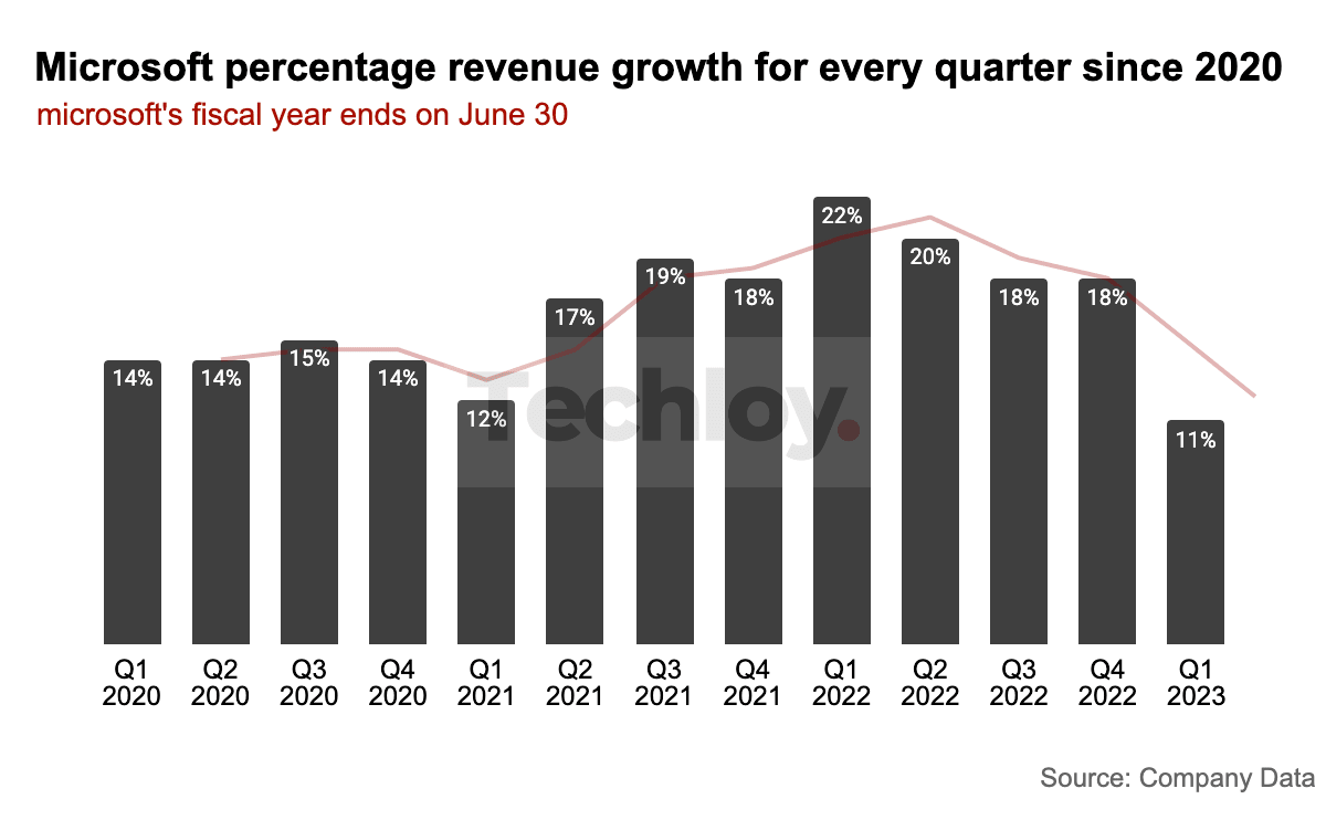 Microsoft has reported a revenue increase of $4.8 billion or 11% year-on-year for its fiscal first quarter with ended in September 2022 (Microsoft's fiscal year FY ends on June 30), the lowest since 2017 levels which went as low as 1% and peaked at 8% increase in revenue.